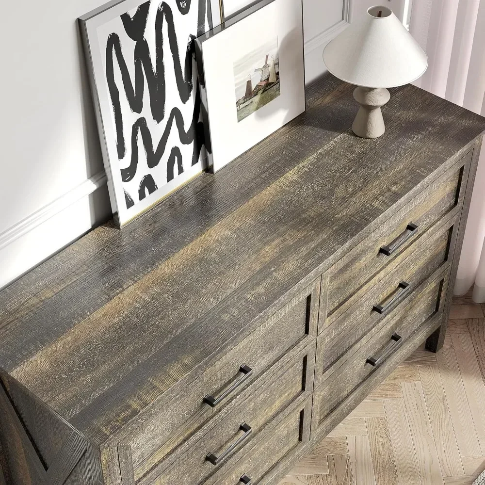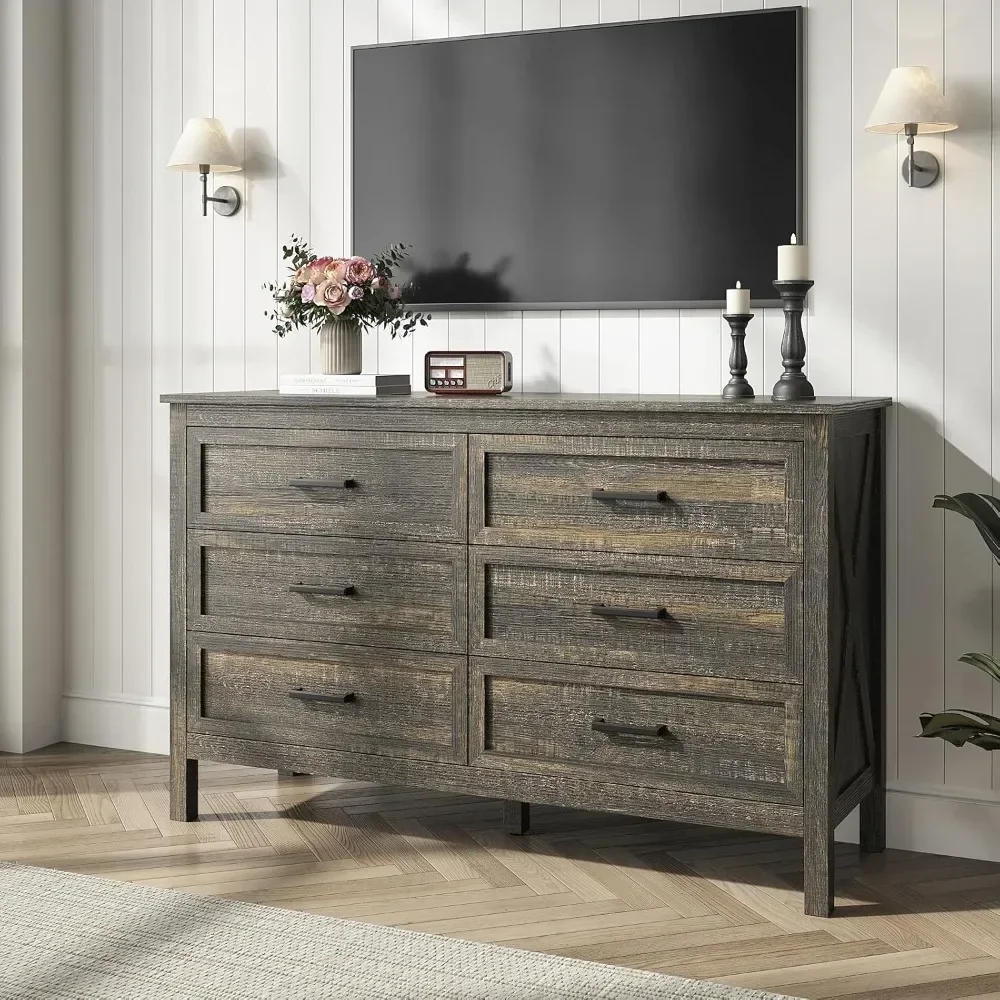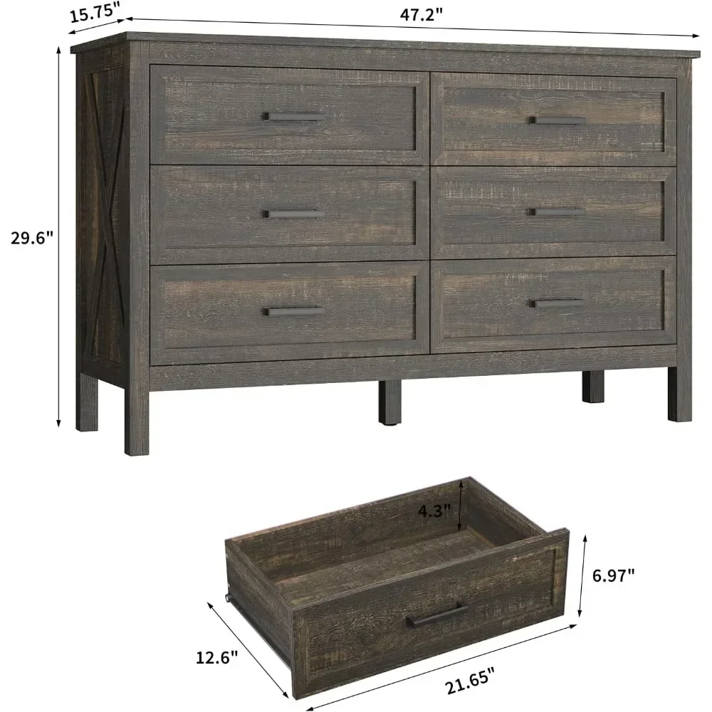 Farmhouse 6-Drawer Dresser: The rustic charm of this dresser adds warmth and comfort to any bedroom, creating a cozy atmosphere. The natural grain of the wood brings a sense of authenticity and individuality to your living space, while the vintage design adds a touch of nostalgia and style. This dresser is perfect for adding a touch of farmhouse charm to any bedroom decor.