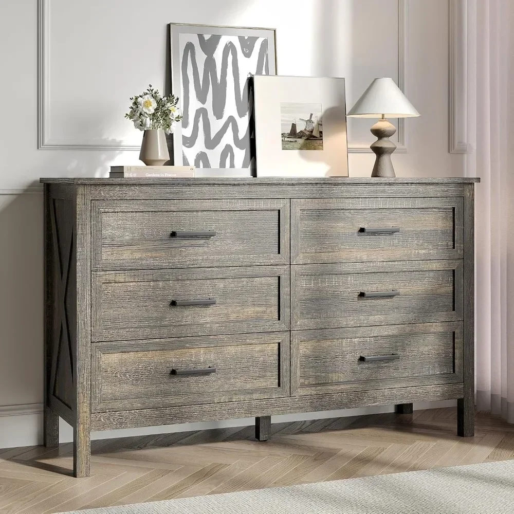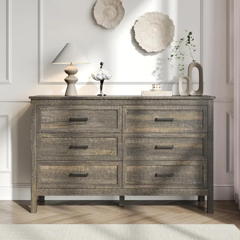 Farmhouse 6 Drawers Dresser for Bedroom, Wood Rustic Wide Chest with Natural Texture, Wood Dressers for Bedroom, Hallway