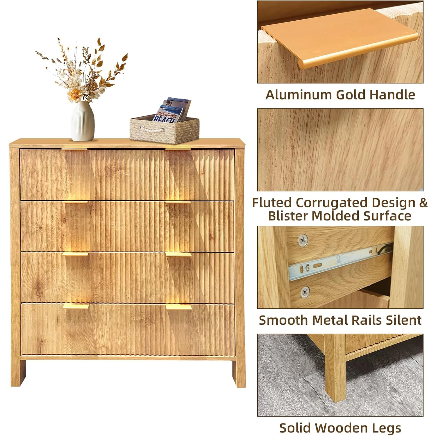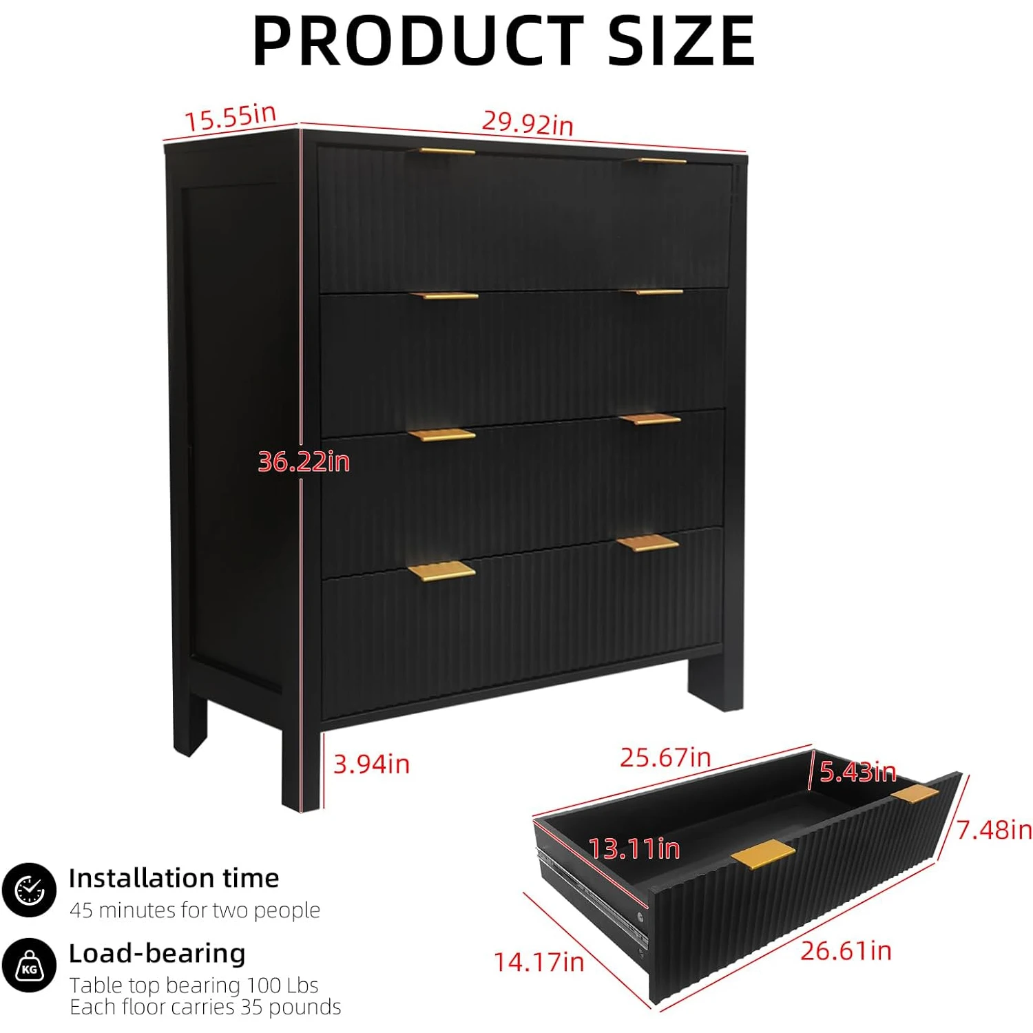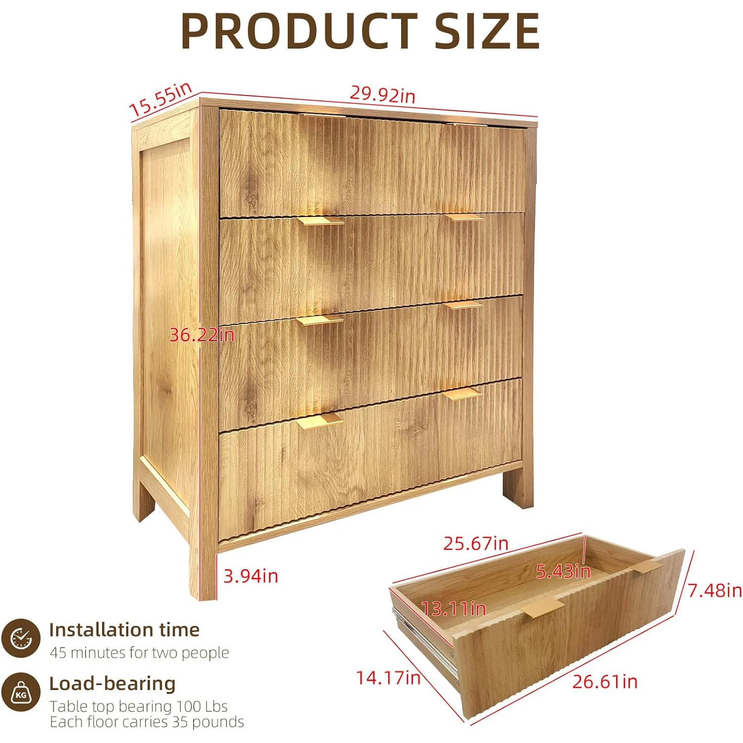 MODERN ELEGANCE WITH FLUTED DESIGN:This elegant wooden 4-drawer dresser combines timeless style with contemporary design, featuring fluted panels that bring a modern charm to any bedroom or living space. With dimensions of 29.92 x 15.55 x 36.22 inches, this piece enhances your decor with its stylish golden handles, making it a standout addition to your home. Ideal as a dresser for bedroom or accent piece, it embodies a balance of modern sophistication and practical functionality.