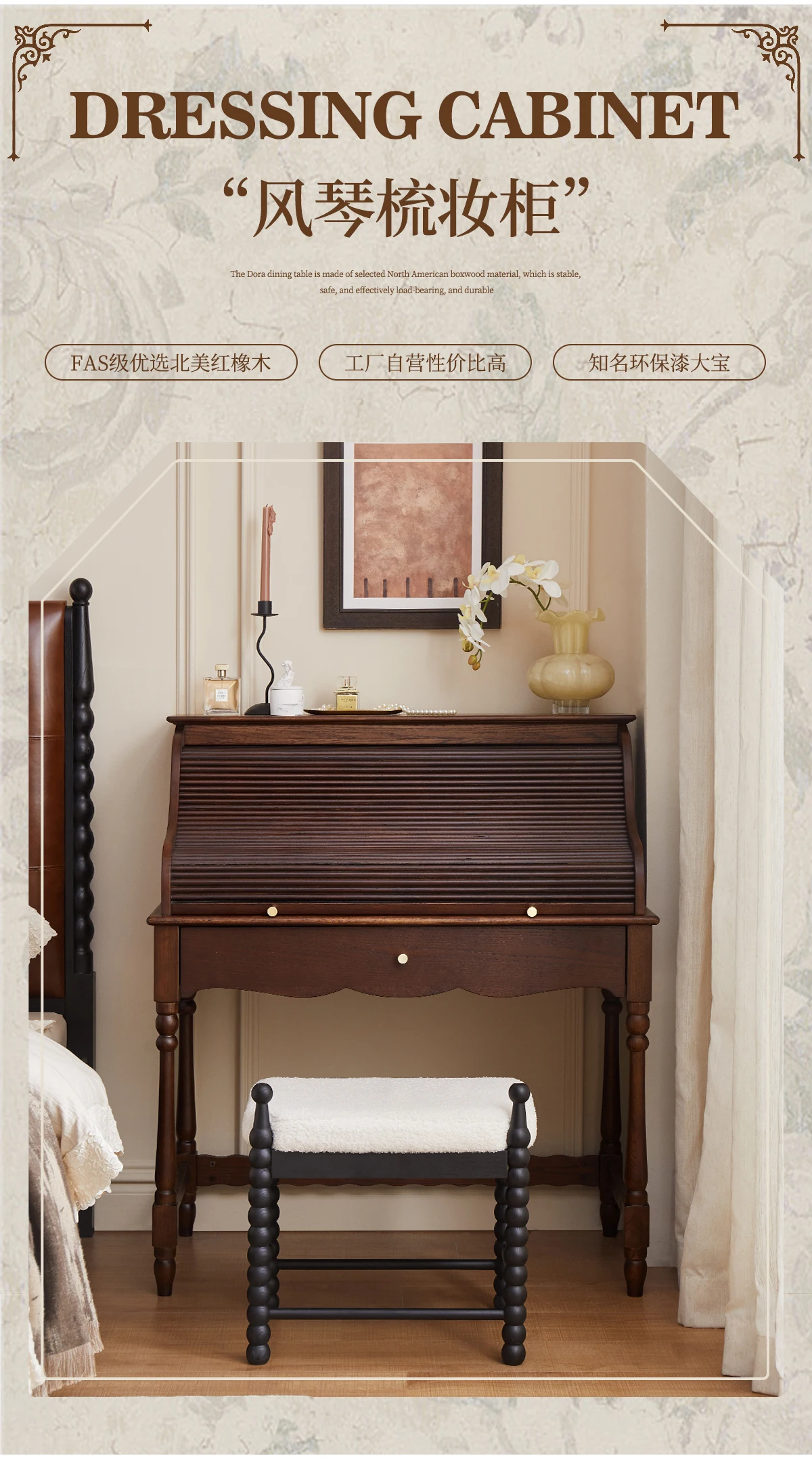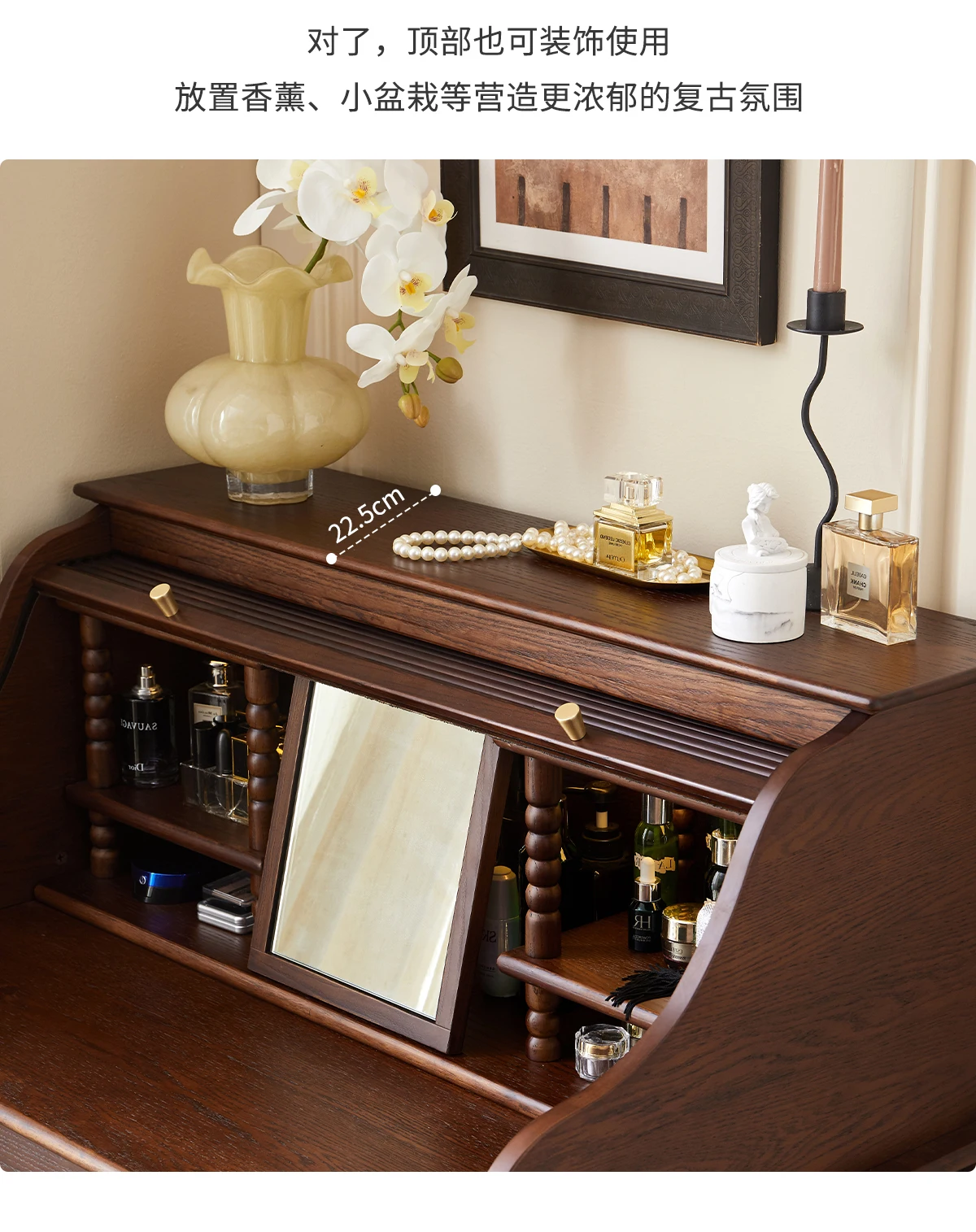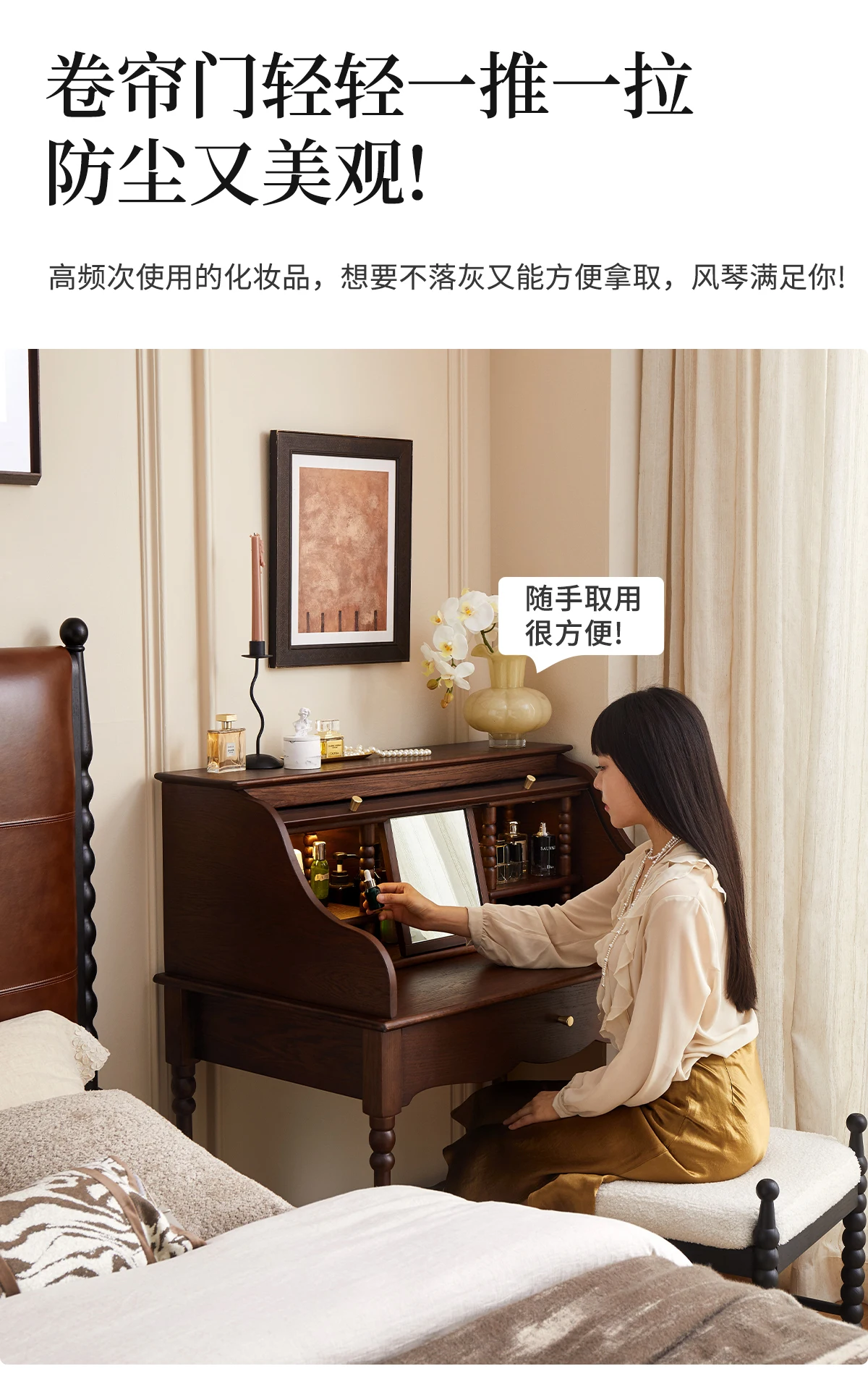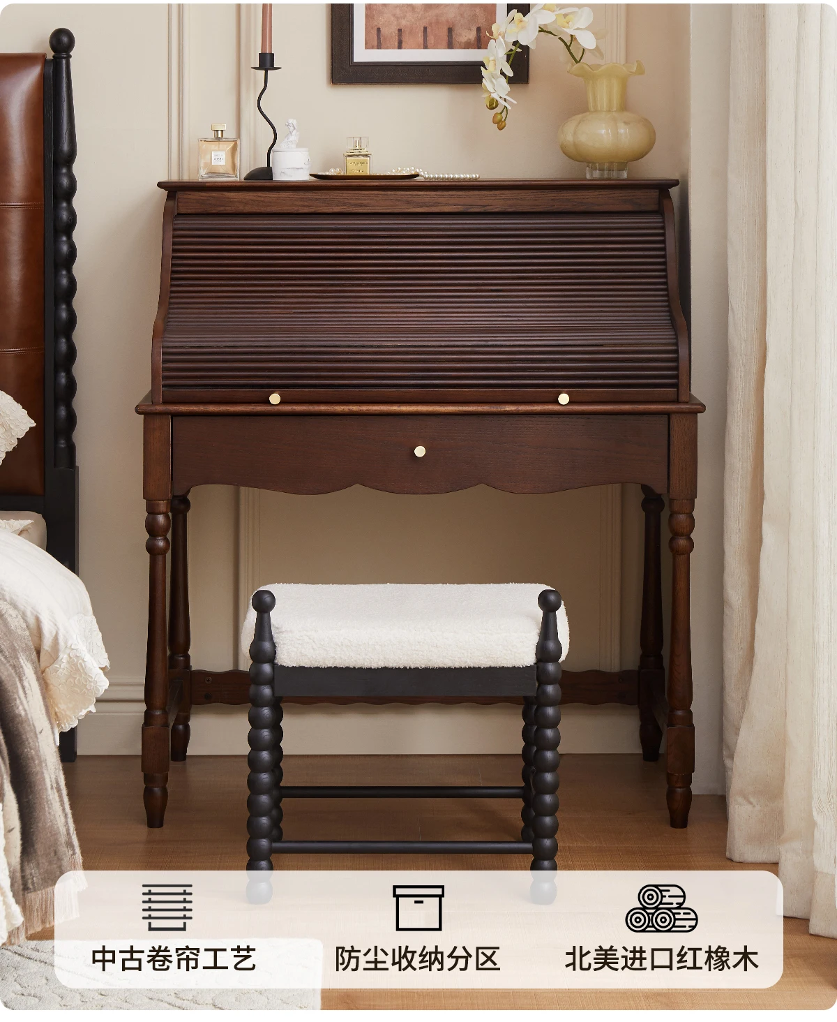 French retro roller shutter dresser medium antique solid wood makeup table storage integrated bedroom small apartment