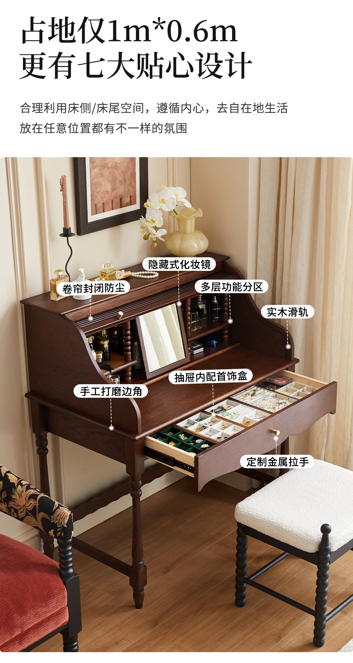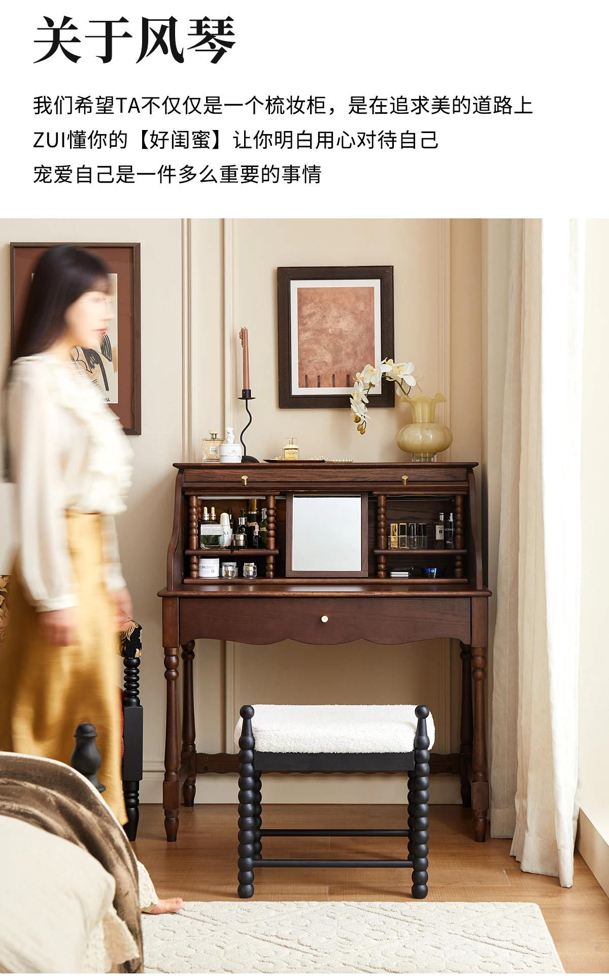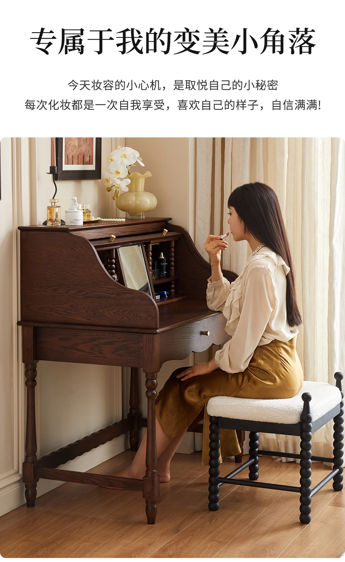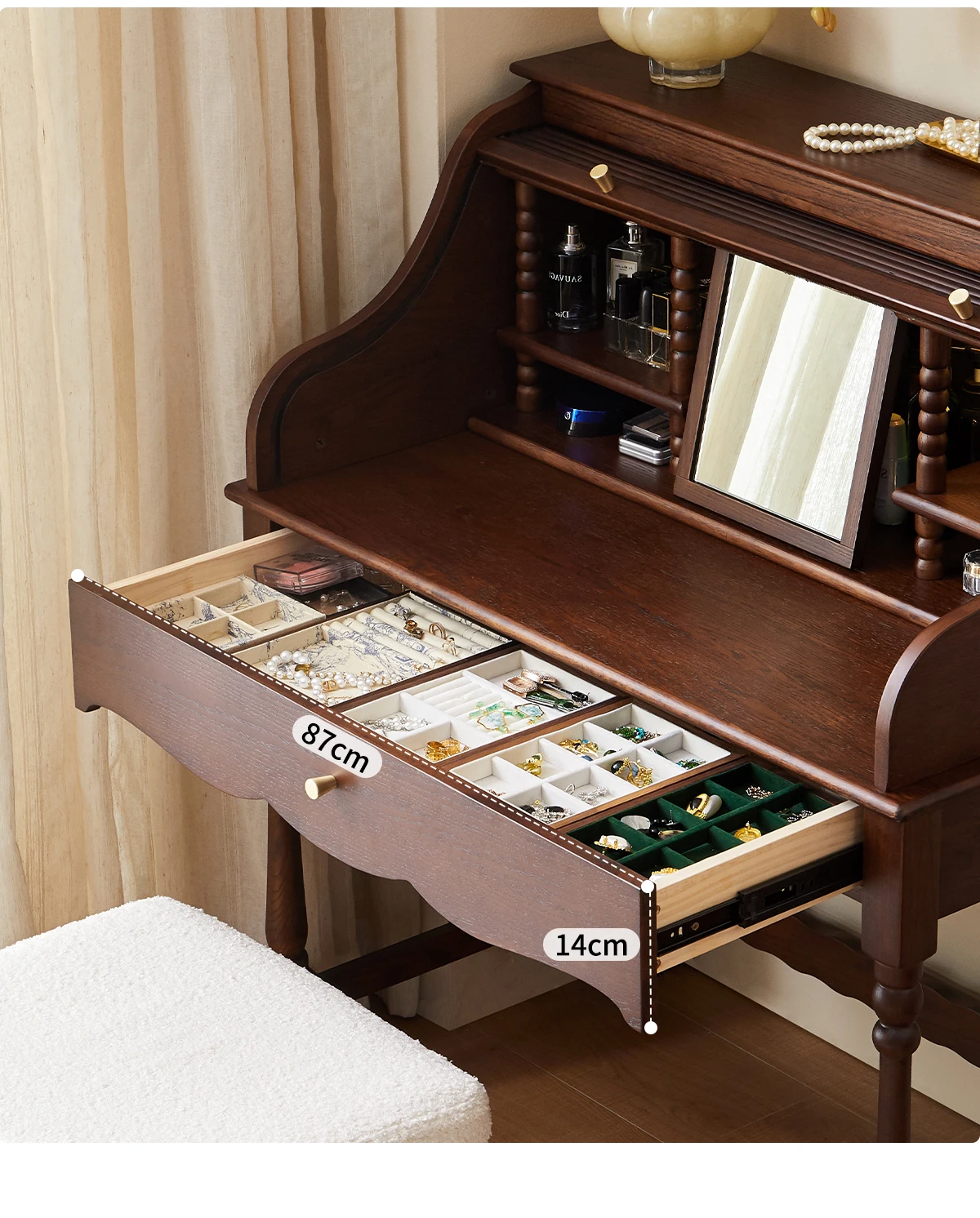 French retro roller shutter dresser medium antique solid wood makeup table storage integrated bedroom small apartment