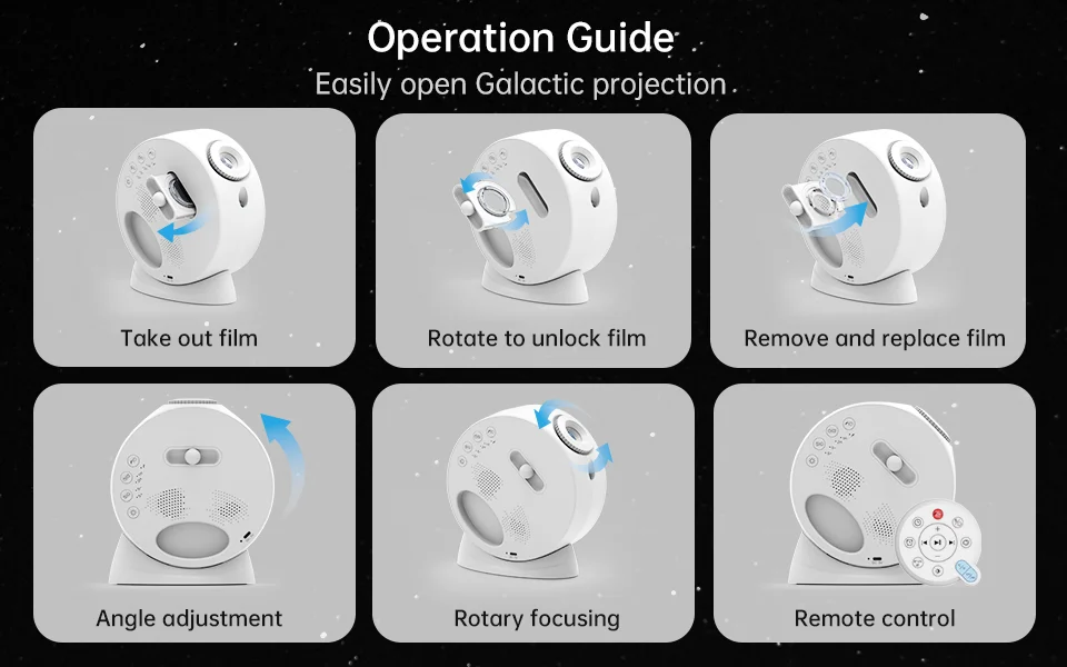 【Educational Audio Projector】Colorful Night Light Projector for kids room only need 3 steps to take you through the planetarium visual experience: Insert film disc - Turn on switch - Adjust focus. Simple design perfect for kids using. Intersting manual switching of film sheets helps children's intellectual development good. Put the disc into the device, this home planetarium projector can auto recognize the disc and play the related educational scientific audio