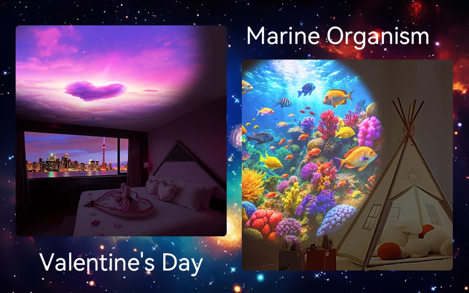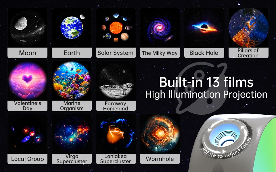 【The 7 Upgraded 13 in 1 Planetarium Projector】This Galaxy Star Projector comes with 13 different 4k HD galaxy discs.1.Moon- The Milky Way 2.Earth 3.Solar System 4.The Milk Way 5.Blck Hole 6.Pillars of Creation 7.Valentine’s Day 8.Marine Organism 9.Faraway Homeland 10.Local Group 11.Virgo Supercluster 12.Laniakea Supercluster 13.Wormhole These Realistic galaxy film discs taking you to experience an fantastic universe world. Bring me to your home, I will create starry sky for the little one