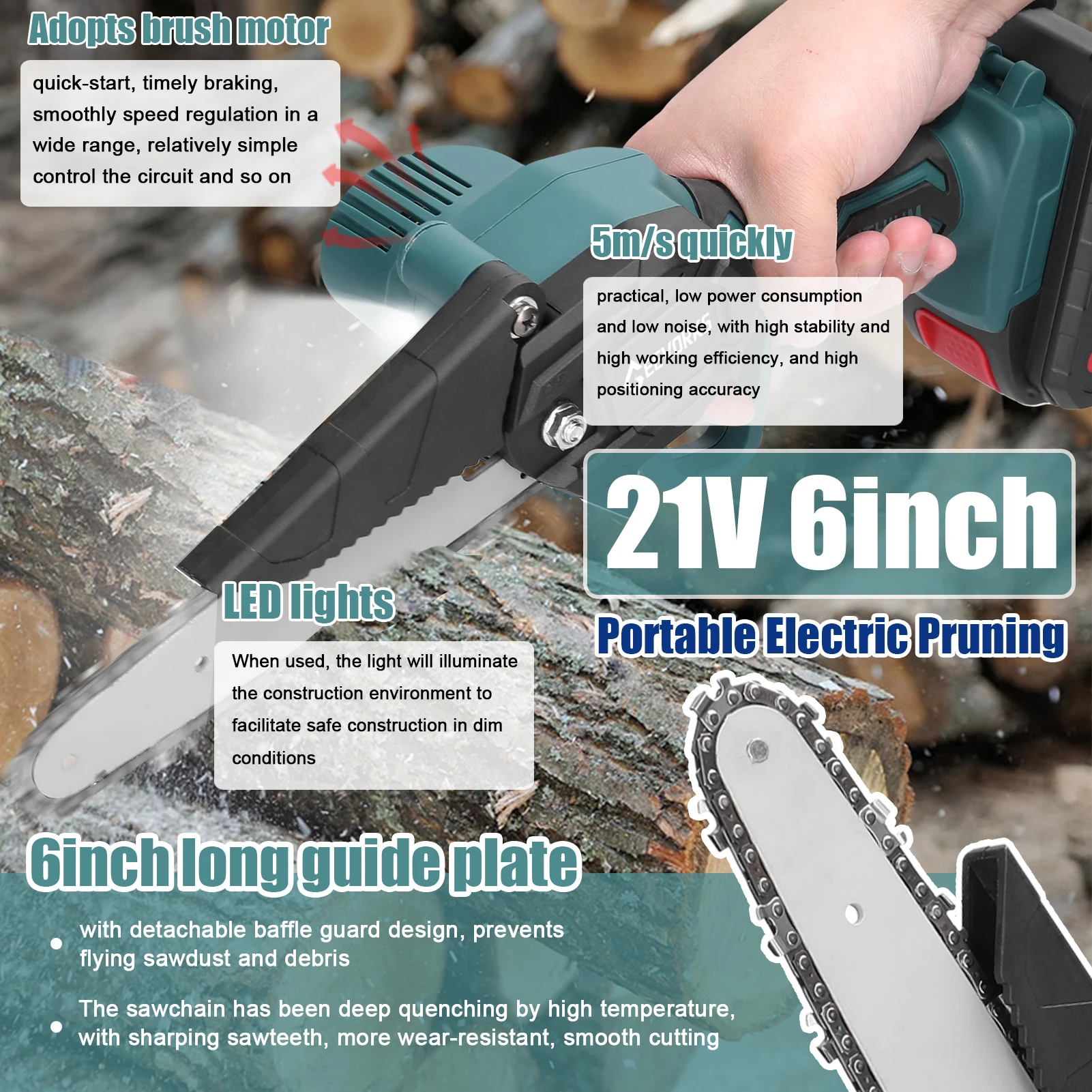 Cordless design, lightweight and portable, easy to carry out and cutting the wood.