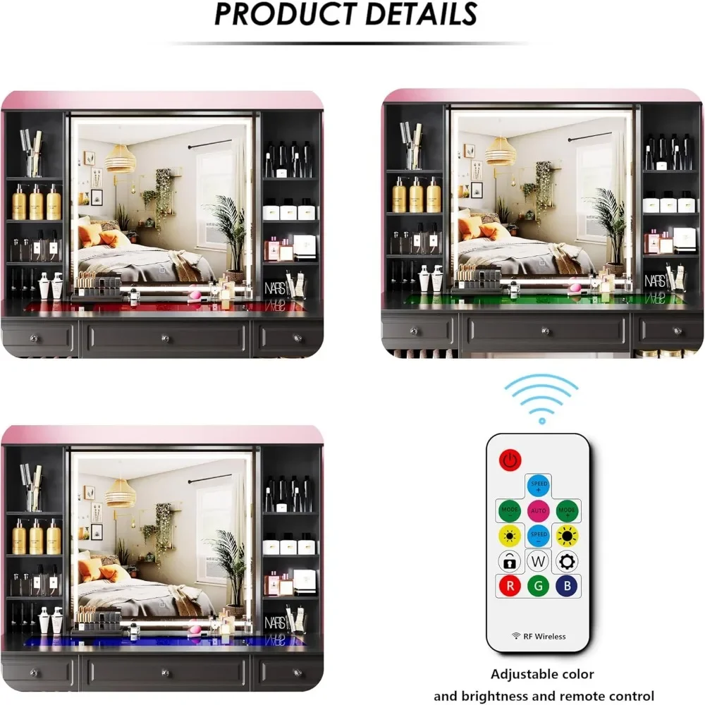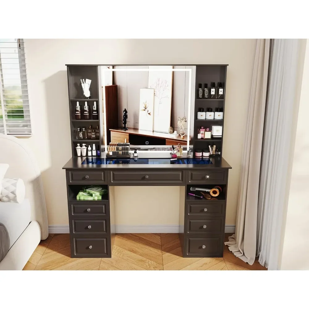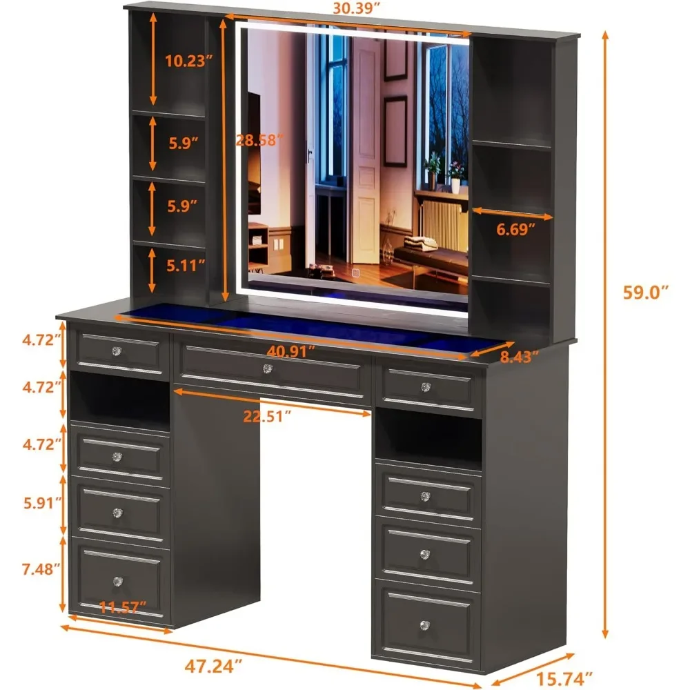 Glass Top Vanity Desk with Lighted Mirror, Large Desktop Makeup Vanity Table with 9 Drawers,Crystal Ball Knobs, Clear Top Vanity