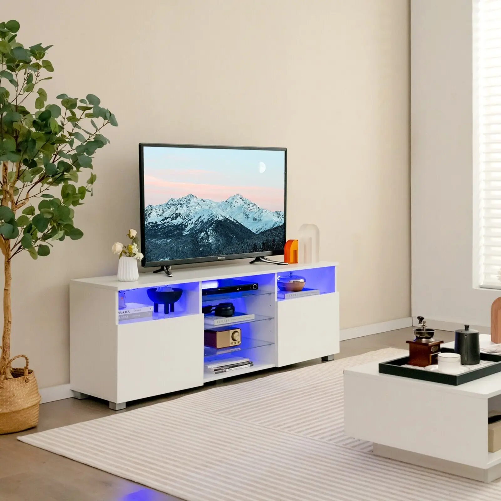 This well-designed LED TV stand will enliven your living space! Multi-color LED light strip features 22 dynamic modes, 20 static colors, 5 adjustable brightness and speed to create a magic light show for a romantic atmosphere. Spacious desktop is compatible with the size of most television panels. And the pre-drilled cable management holes are designed to organize wires. Moreover, 5-position glass shelves, 2 open compartments and 2 large cabinets display its strong performance to store various items. Bring this LED entertainment center home which strikes perfect balance between functionality and stylish design!