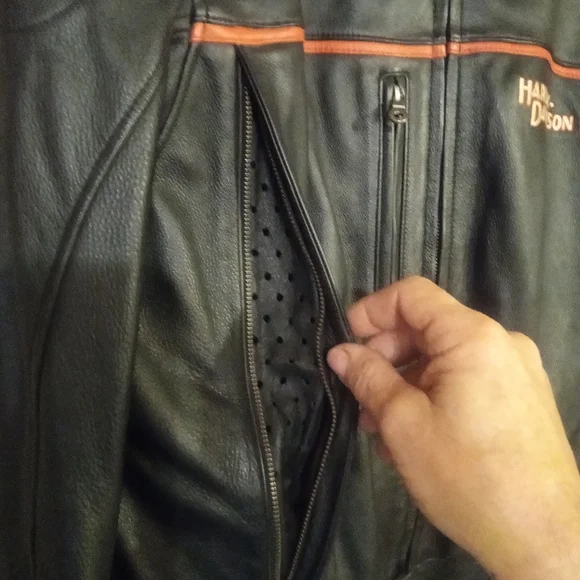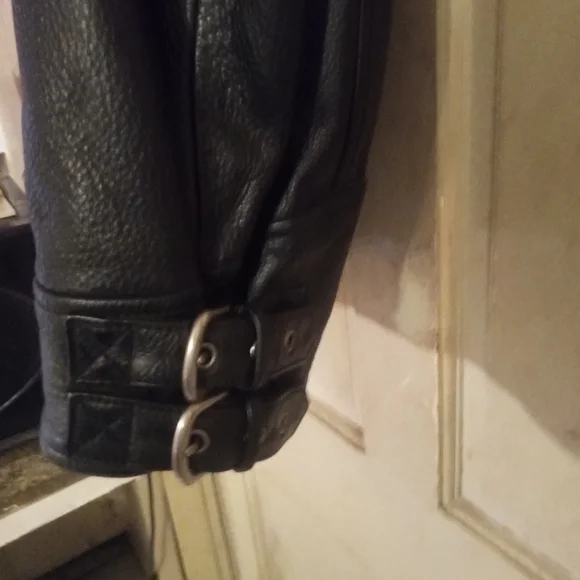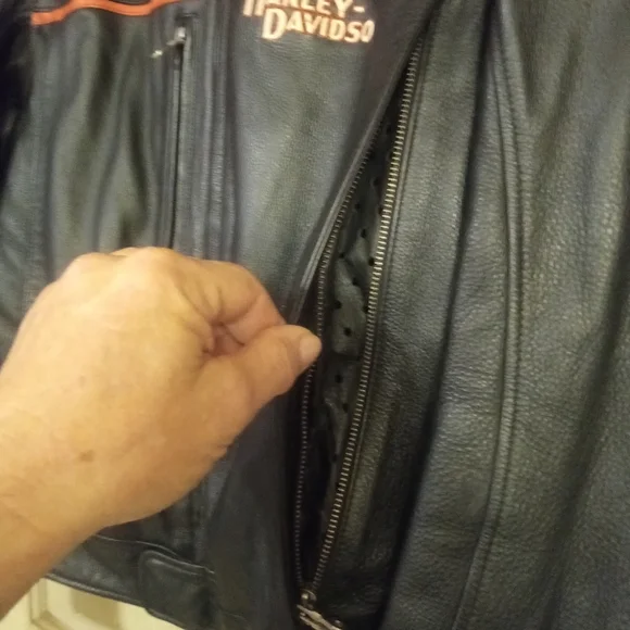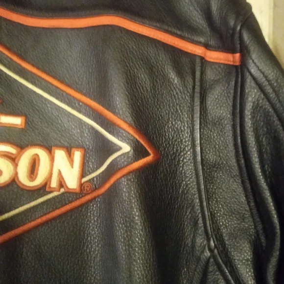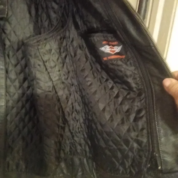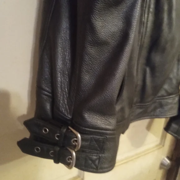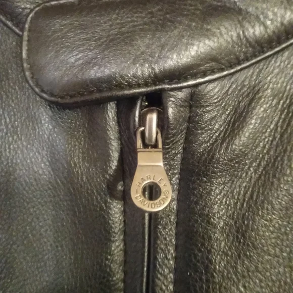 This is a flawless like new classic Harley Davidson leather riding jacket with a Harley Davidson zip in liner it is one of the highest quality softer style leather jackets Harley Davidson has produced from the quality of the leather, zippers, stitching to thebuckles! there is not a scratch,scuff or flaw to be found in this classic jacket!