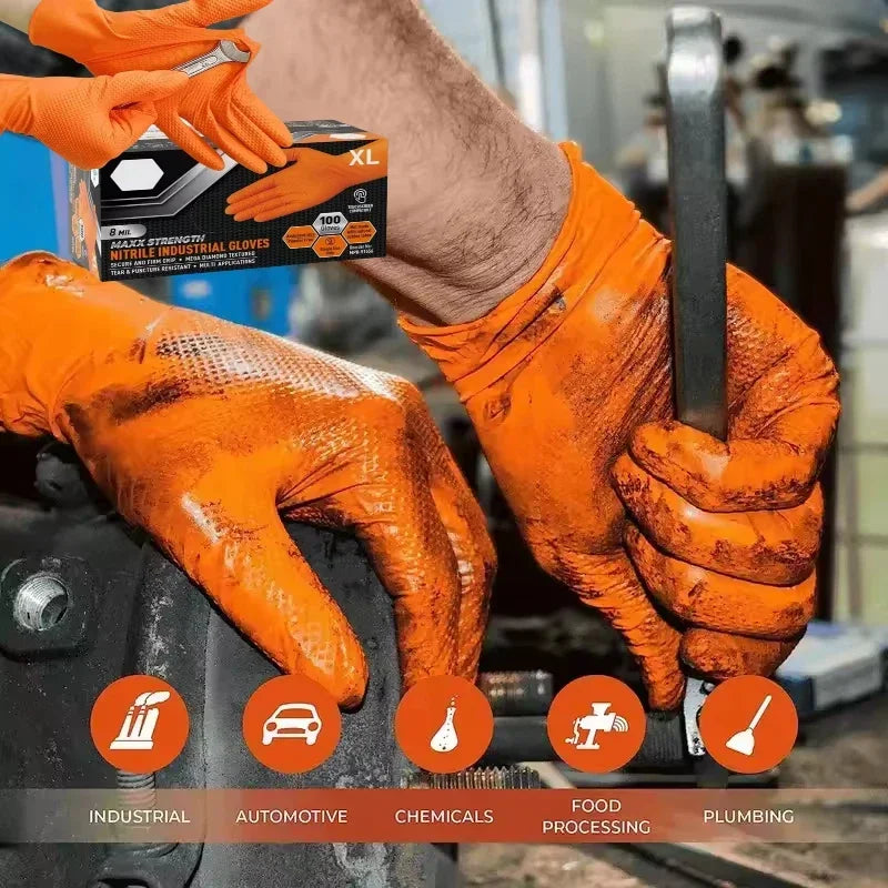 1.RAISED DIAMOND TEXTURE: With fully textured fingers and palms featuring raised diamond patterns, our nitrile disposable gloves offer an enhanced grip that is 60% stronger than standard thick nitrile gloves. This advanced texture ensures superior control on wet, dry, slippery, and oily surfaces, making it easier to handle liquids and perform tasks with confidence. Count on these mechanic gloves disposable to provide exceptional chemical and puncture resistance.
