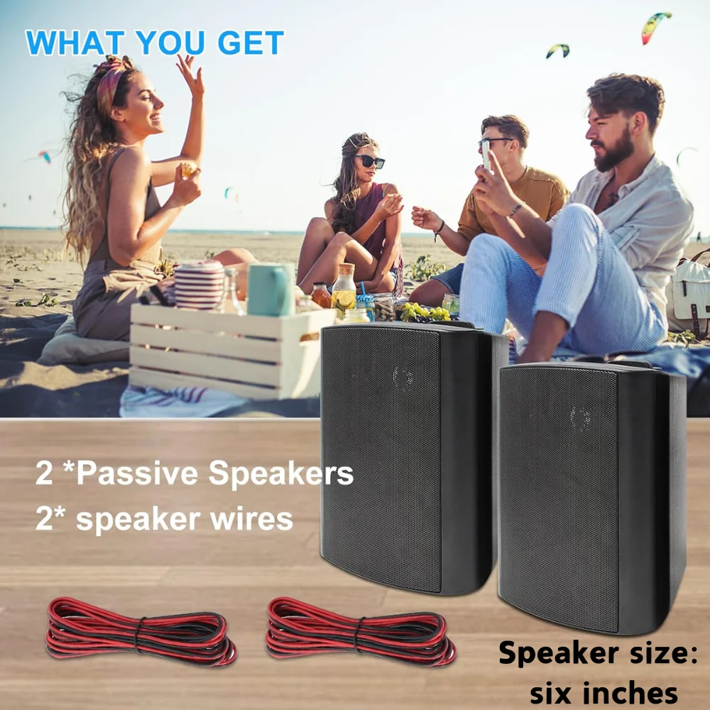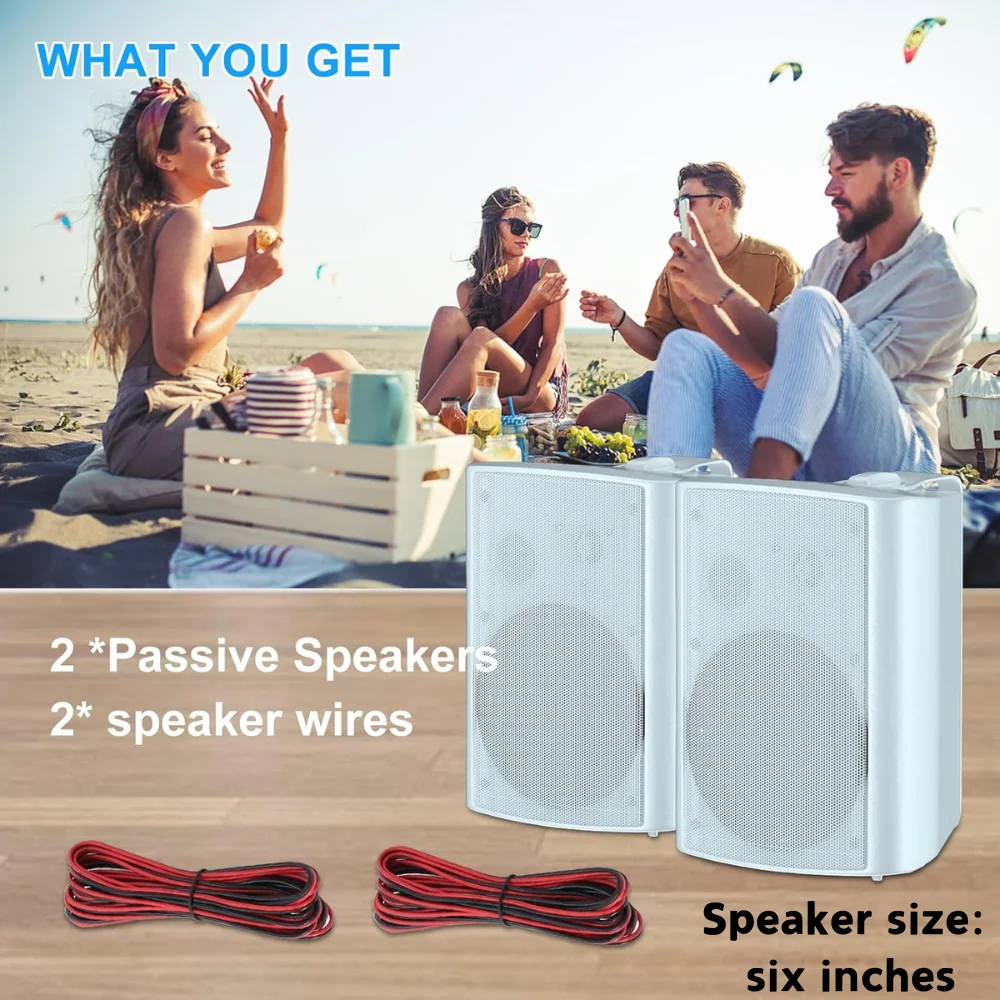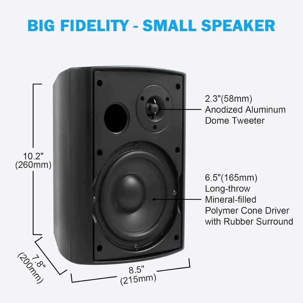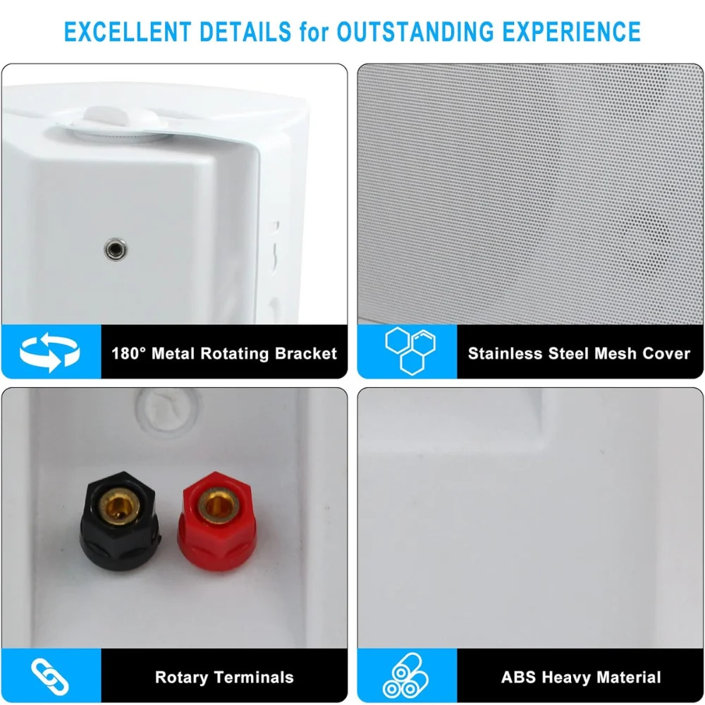 ALL WEATHER OUTDOOR SPEAKER: With a rating of IP44, the Wall Mount outdoor/indoor Speakers are water and dust resistant, specially designed to withstand most environments. Hang your speakers outside without fear of damage. Adjustable/locking swivel mounting brackets allow for optimal sound dispersion.Simply Mount the swiveling U-bracket. Adjust angle and fasten the speakers with a click