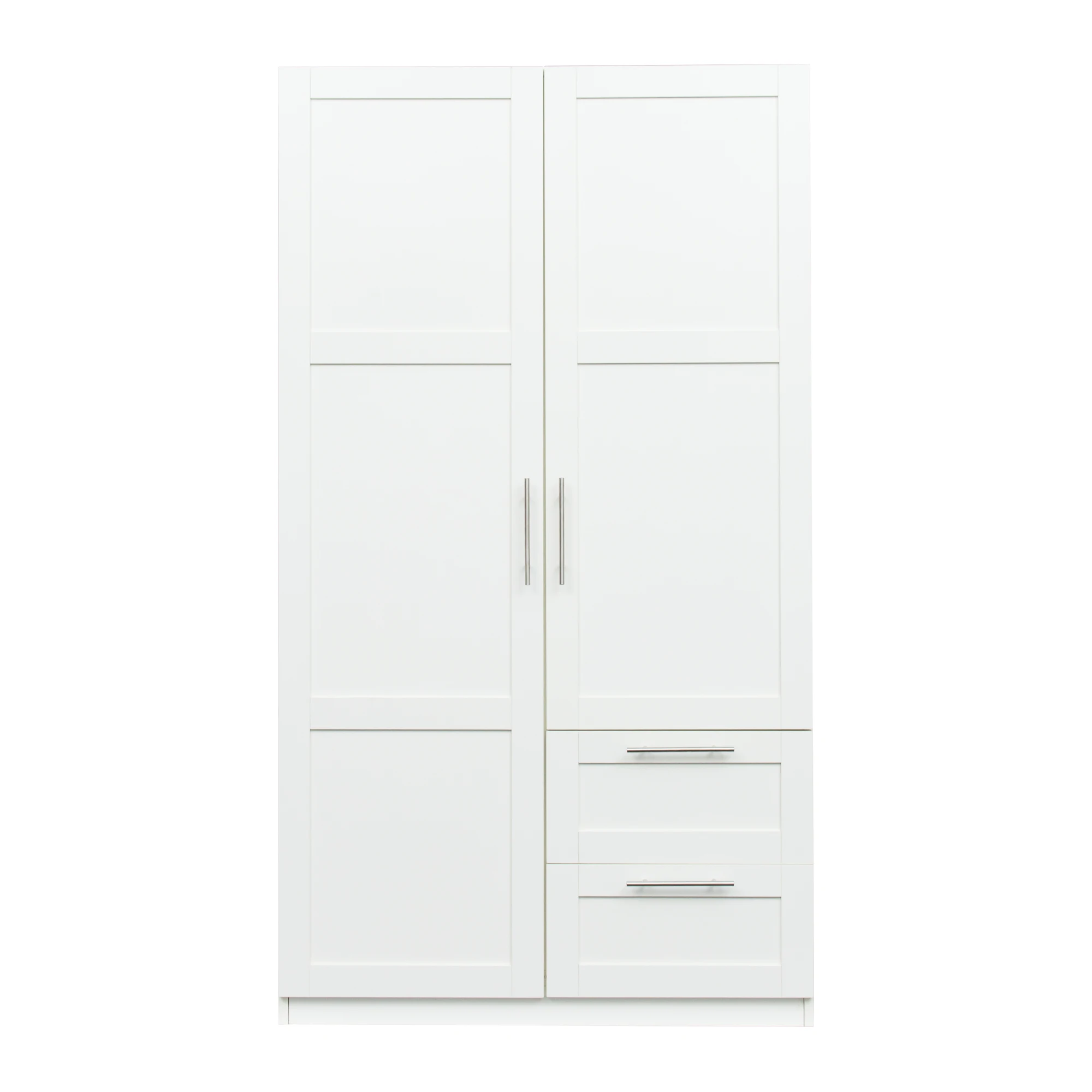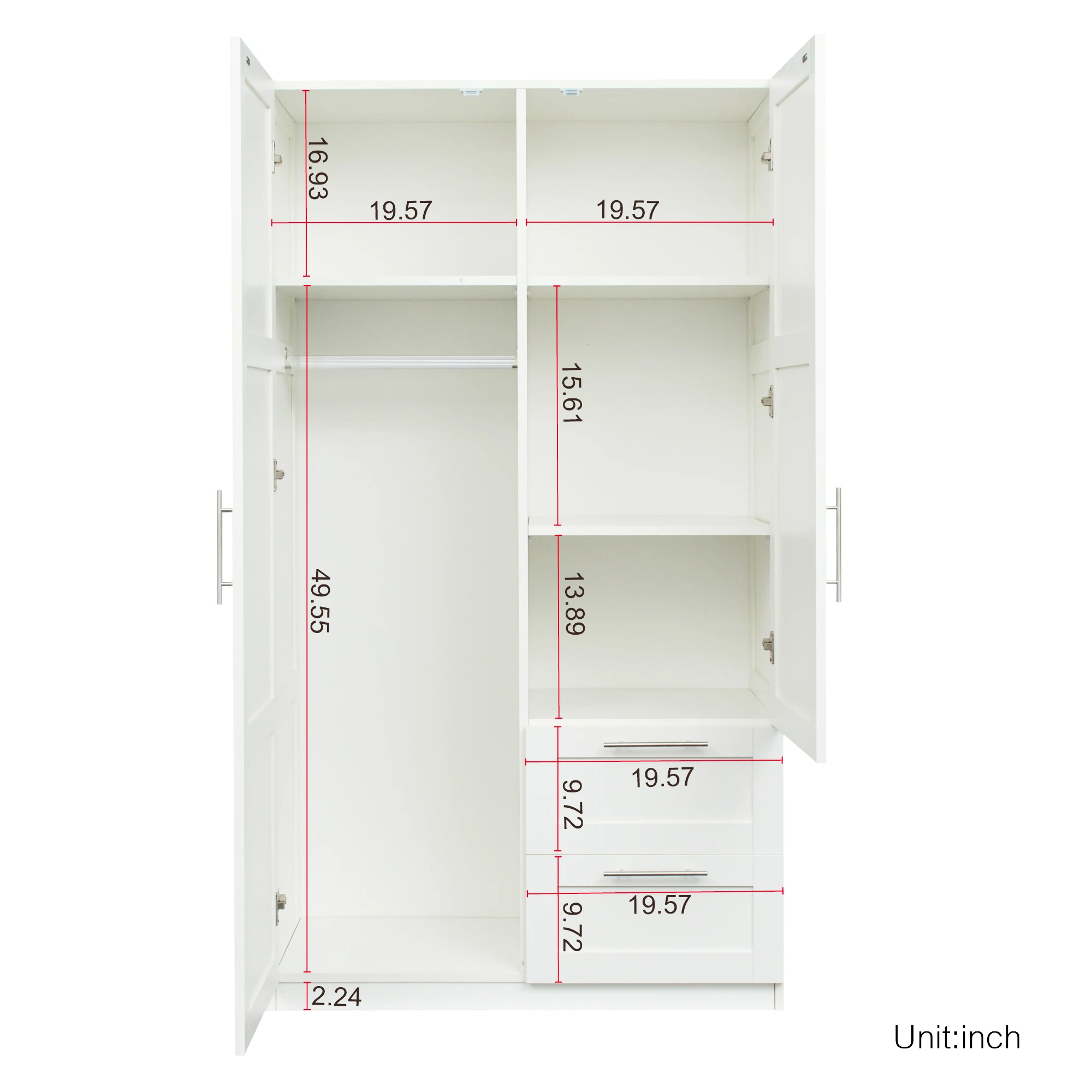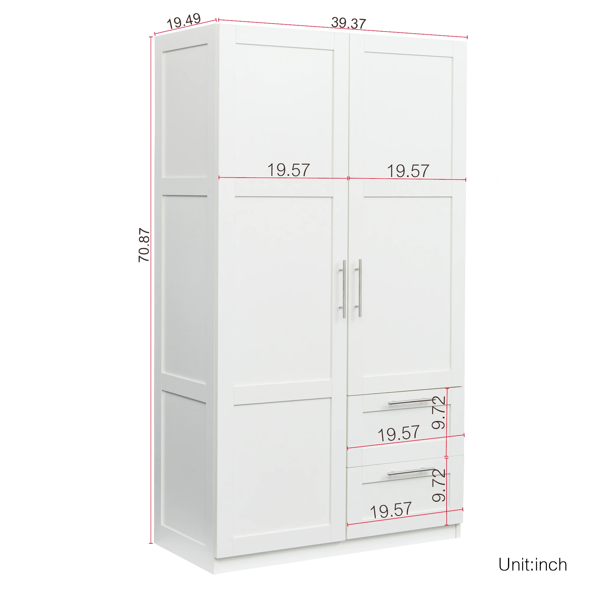 Dimensions: 39.37”W x 19.49” D x70.87”HThere are 2 doors, 2 drawers and 3 partitions to separate 5 storage spaces, providing more storage areas.Material: This Wardrobe material is melamine MDF, which is of very good quality, smooth surface, easy cleaning, durability and easy maintenance.Durable&Sturdy frame: This wardrobe with rich textured veneer not only gives an attractive modern look but also features superior stability and its resistance against wear and tear.Worry-Free Assembly: Comes with all necessary hardware and an illustrated instruction manual to help you install this wardrobe quickly and without diff iculties. Please feel free to contact us if you encounter any problems during the assembly process. We will provide the best solution online 24 hours all day.