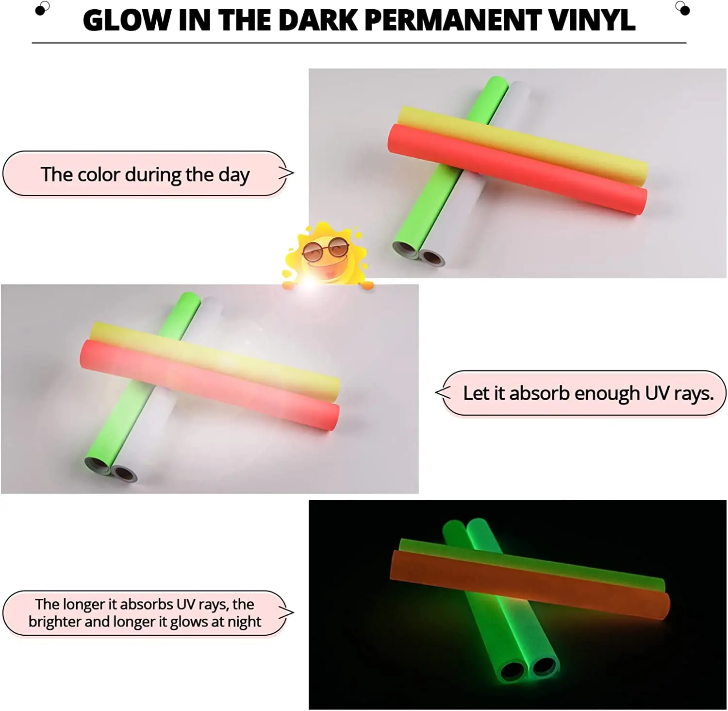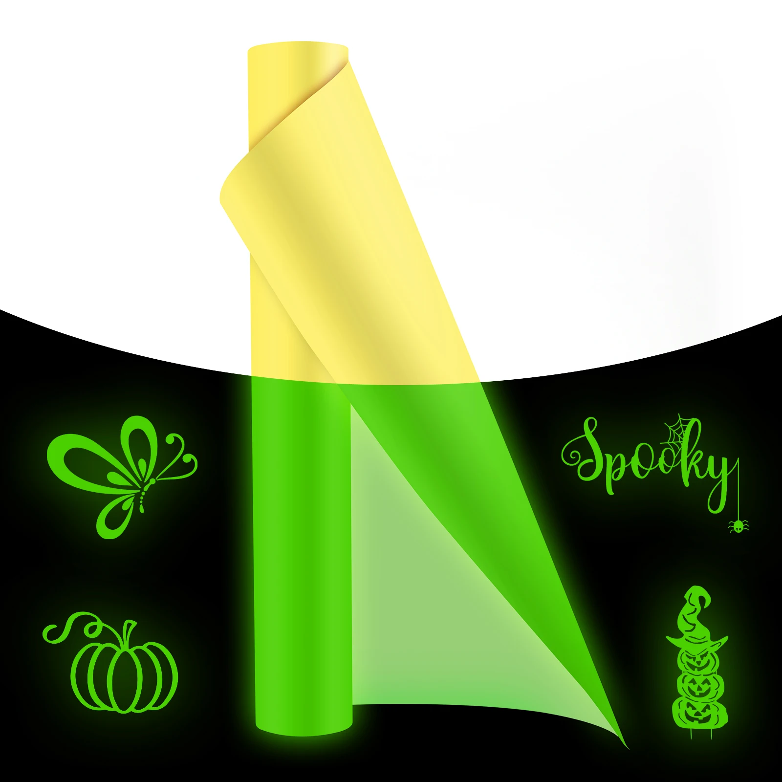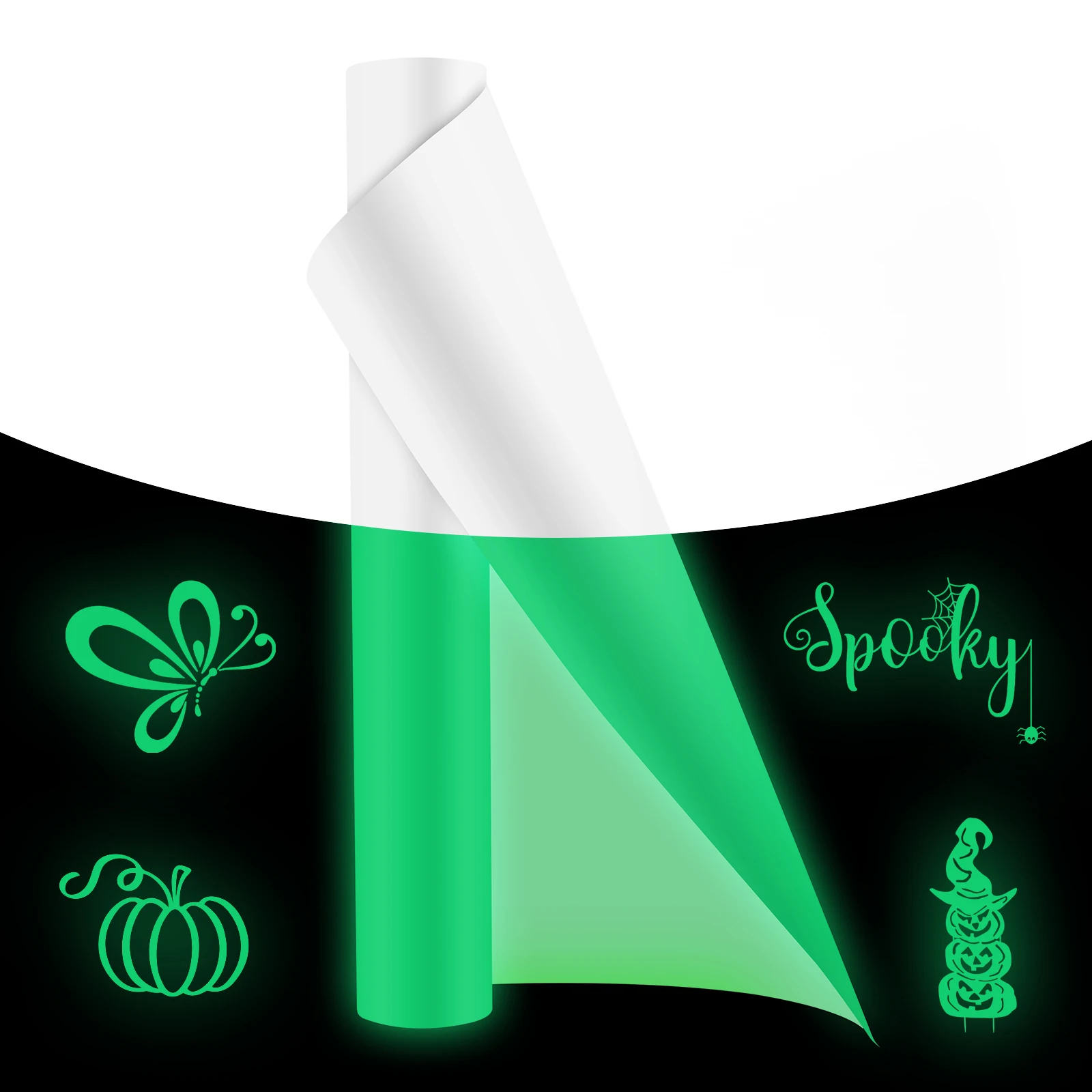 • PET BACKING: This glow-in-the-dark permanent vinyl adopts PET backing instead of paper backing. So, it can adhere firmly to the fabric with fewer bubbles and wrinkles. It is also efficient to peel to avoid ruining your cutting mat and pattern. You will get a complete pattern after peeling and don't need to clean the mat. HTVRONT permanent vinyl is committed to bringing you a better carfting experience.