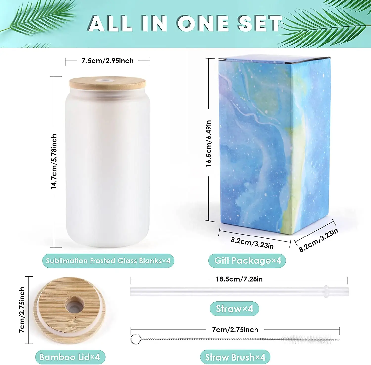 【Include All You Need】Our sublimation glass can set includes 4 frosted glasses with lids, 4 plastic straws, 4 straw brushes, and 4 exquisite gift boxes and an instruction sheet.And Our sublimation glass can set includes 8 clear glasses with lids, 8 plastic straws, 8 straw brushes, and 8 exquisite gift boxes and an instruction sheet. To deliver users a satisfying shopping experience, we also secure the clear sublimation glass tumbler with plastic foam to avoid damage in transit.