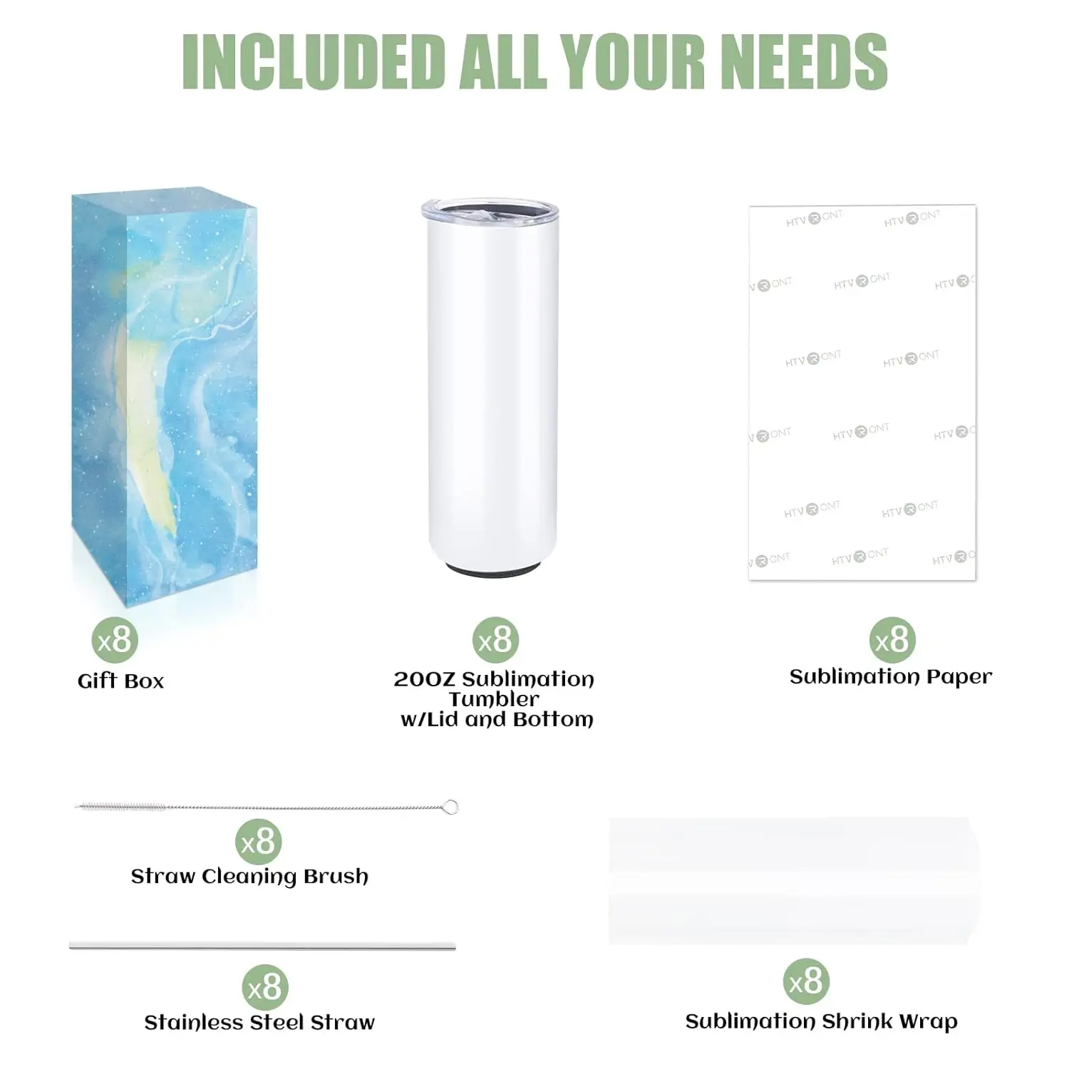 🎁【Included All Your Needs】- Our tumblers for sublimation come each with its own gift box, lid, straw, brush and rubber bottom. What's more, bulk blank tumblers also include sublimation shrink wrap and sublimation paper. All you needs is ready, just print-wrap-bake, you will get a unique and distinctive sublimation tumbler. Why not making some lovely gifts to your families or friends with HTVRONT blank sublimation tumblers?