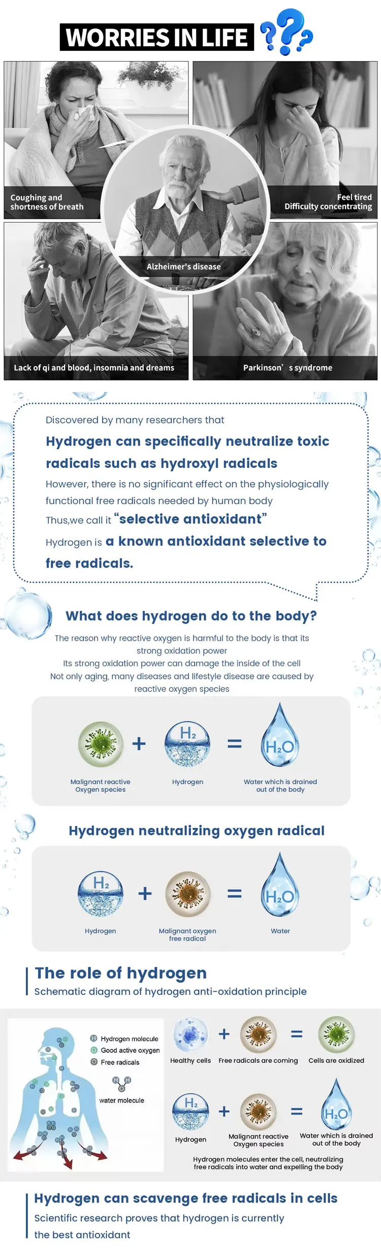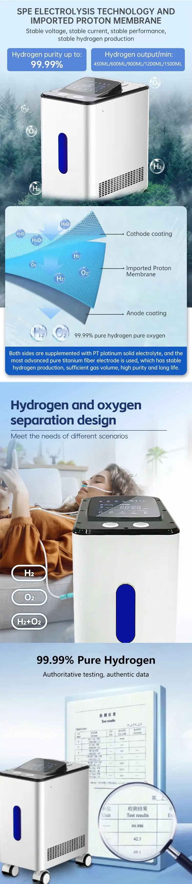 This portable hydrogen oxygen generator is Exported to many countries and regions, including the Middle East, Africa, Asia, Europe and America, etc. because it canprevent cancer, depression, Alzheimer's, Parkinson's, etc.It can also help patients sleep better, relieve pain, and even increase their life expectancy. SPE electrolytic cell, using the world's most advanced technology platinum coating, can meet the hydrogen oxygen demand to a greater extent, improve the body immunity. longer life than traditional membranes, food-grade water tanks are safer, automatic water quality detection, voice prompts for easy use.