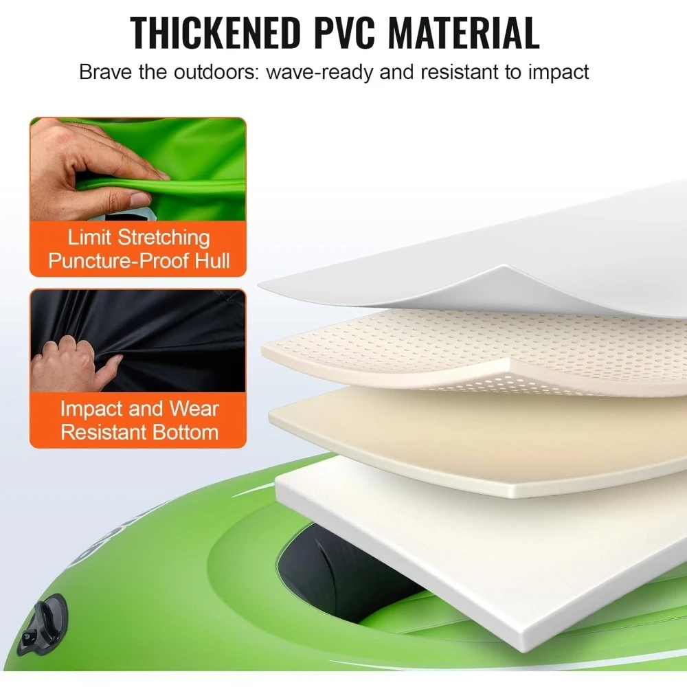 • Enhanced PVC Durability: Constructed from thick, enhanced PVC, this inflatable raft boasts superior tensile strength and puncture resistance, ensuring reliable performance in marine conditions. Its large, thick base enhances stability and is designed to resist cuts and wear from sand when beached.