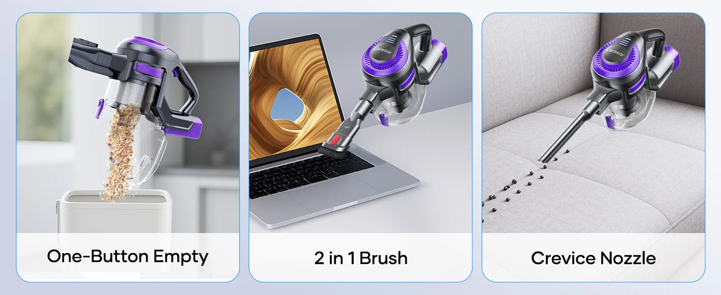 Handles sofa crumbs, carpet dust, car seats, and hard floors.