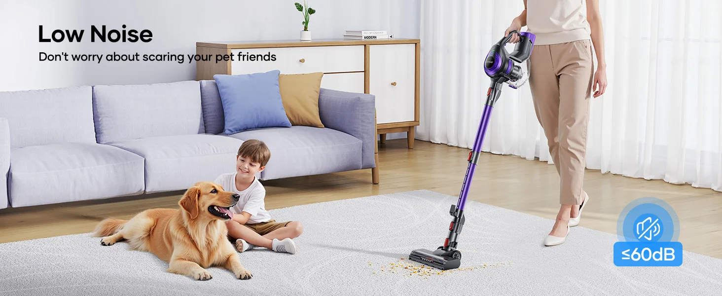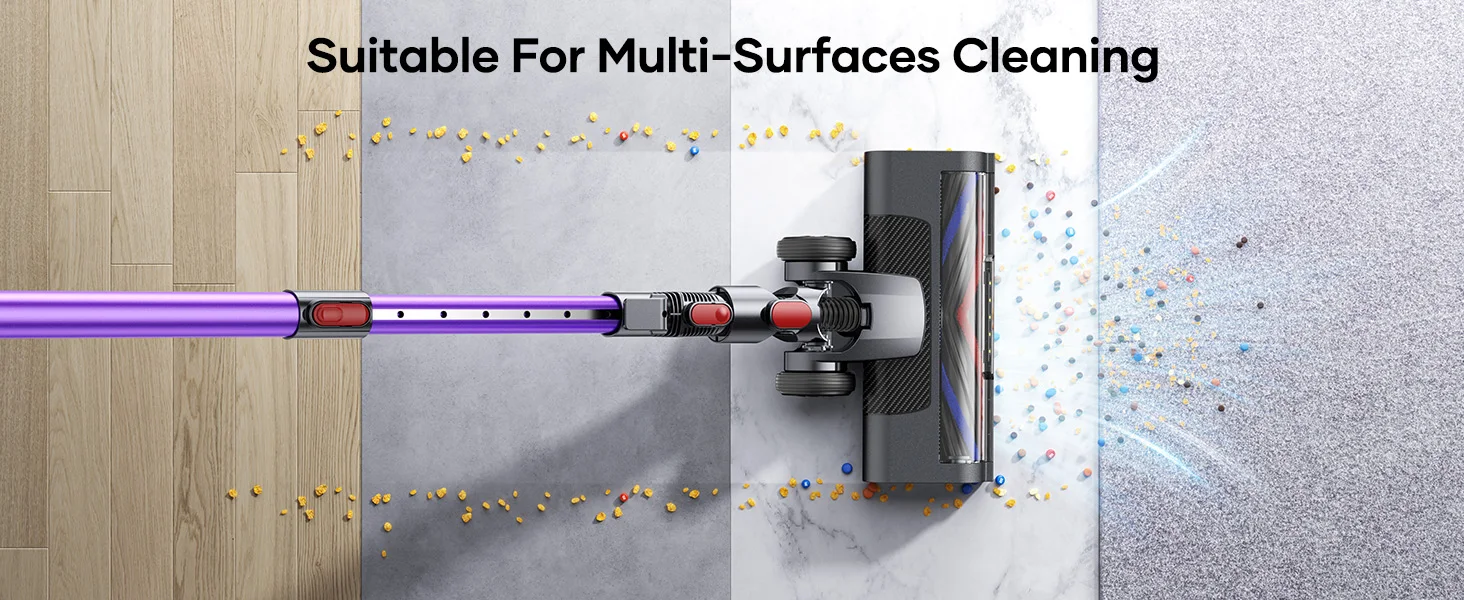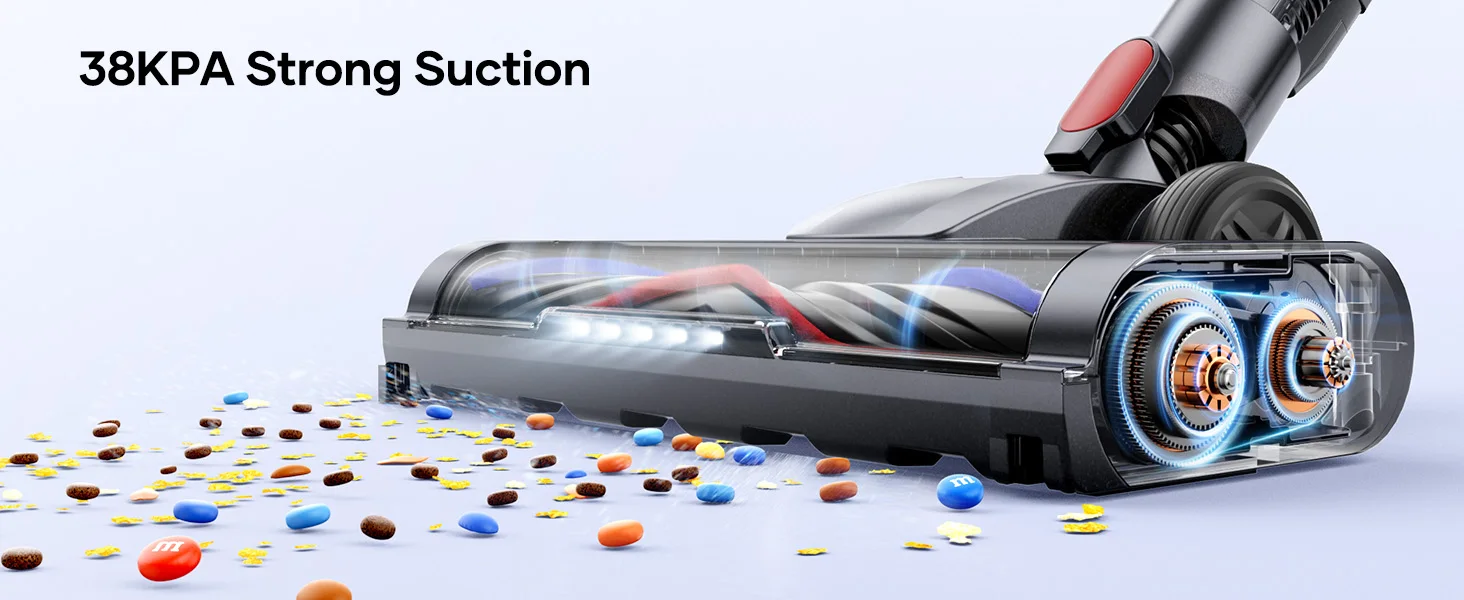 The V10 Lite features a brushless motor with 38KPA Max Mode for deep-cleaning carpets, pet hair, and large debris, while 15KPA Eco Mode offers quiet operation for daily use. Smart suction adjustment protects floors.