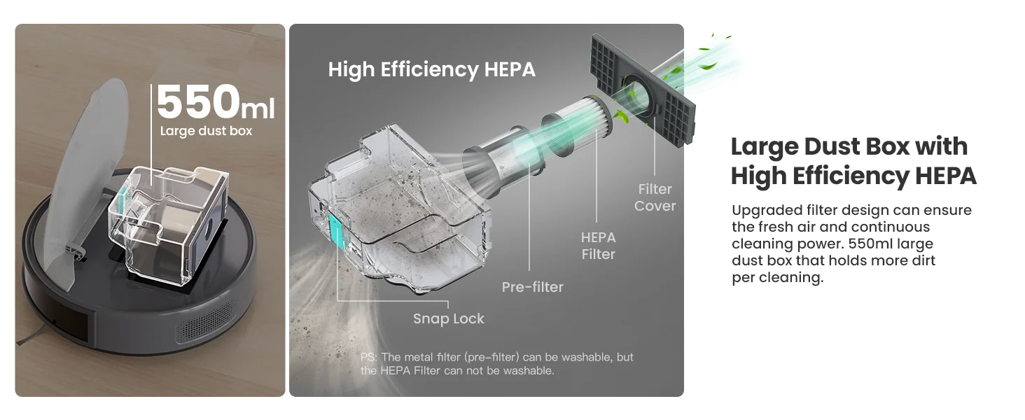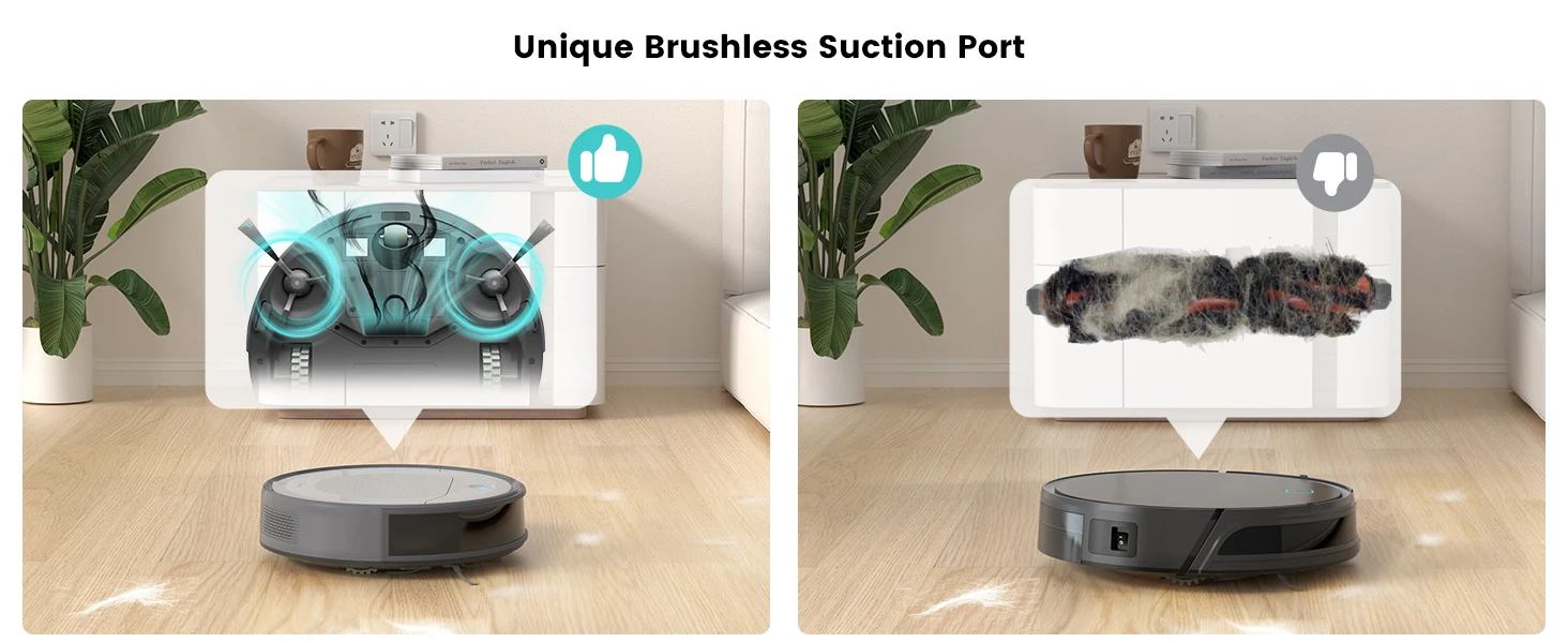 With a compact design, the M310 robot vacuum effortlessly navigates under low furniture and into hard-to-reach corners. Unique brushless design, 4500pa suction and dual side brushes that effectively gather dust, pet hair, and debris.