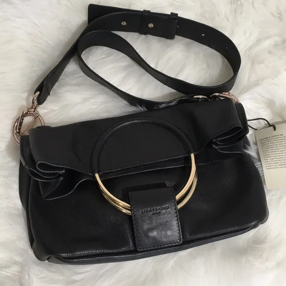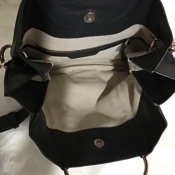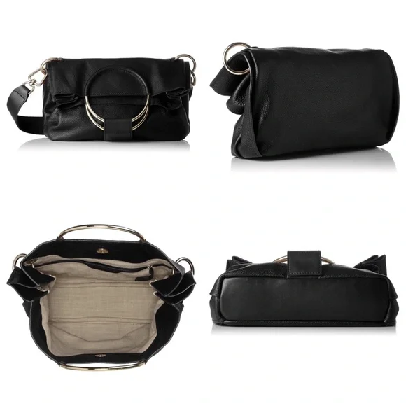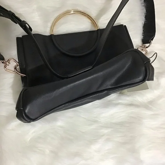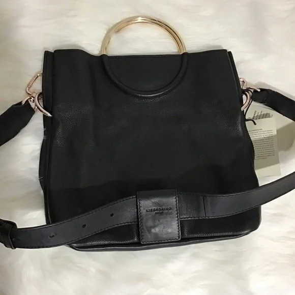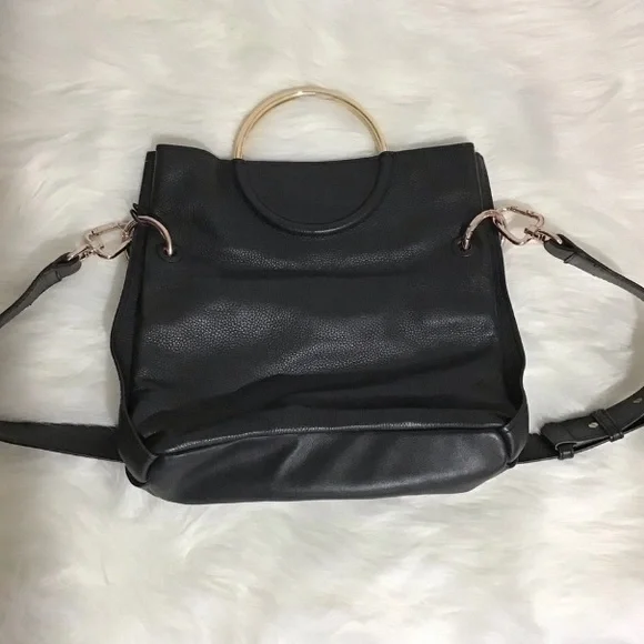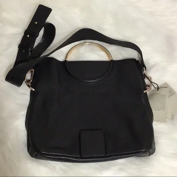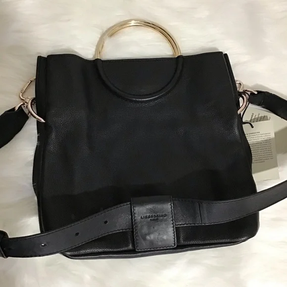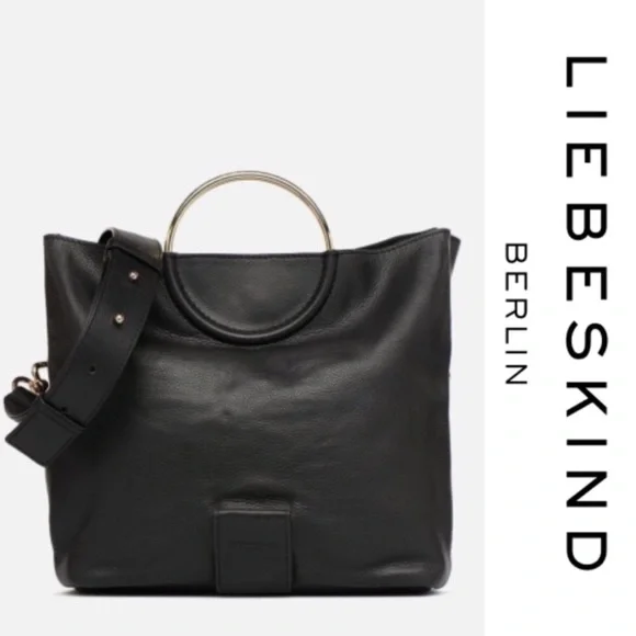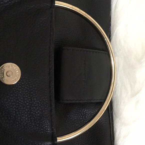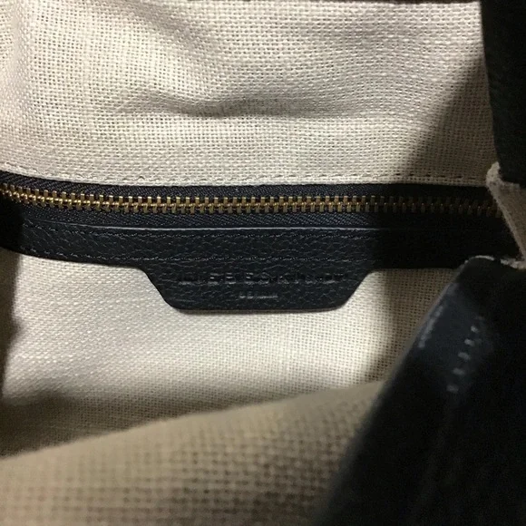 A timeless tote gets a contemporary finish with ultra-chic brass handles. Wear as a clutch, tote, or shoulder bag. *Some discoloration on metal ring. See pics for Condition & Description. Sold As Is. Leather; cotton canvas liningRemovable strapBrass embellishmentsOne inner zip pocketsSnap closureDimensions approximately,10"H, 11"W, 3"D3" handle drop16" optional strap drop