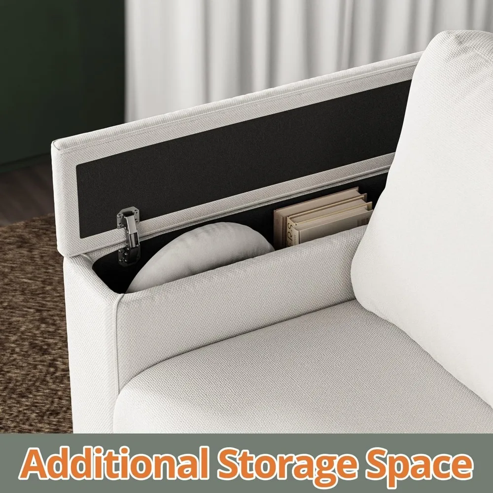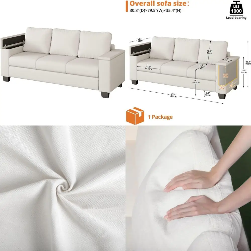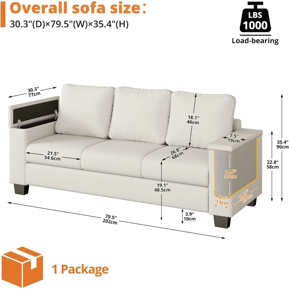 This item features wide armrests with hidden storage compartments, providing convenient and tidy storage for your belongings. The 3-seater couch is designed for comfort and durability, accommodating up to three people. Ideal for small spaces such as apartments, dormitories, and medium-sized living rooms, as well as offices and reception areas, this sofa measures 30.3 inches in depth, 79.5 inches in width, and 35.4 inches in height. It boasts medium plush comfort, supported by a solid wood frame, springs, and high-density foam, capable of bearing up to 1000 pounds. The sofa is covered in a durable, breathable, and non-pilling fabric that is also pet-friendly. The back cushions and pillows are removable and can be easily machine-washed with a zipper. The sofa comes in one package, compressed for easy transportation, with all additional parts stored within the seat compartment.