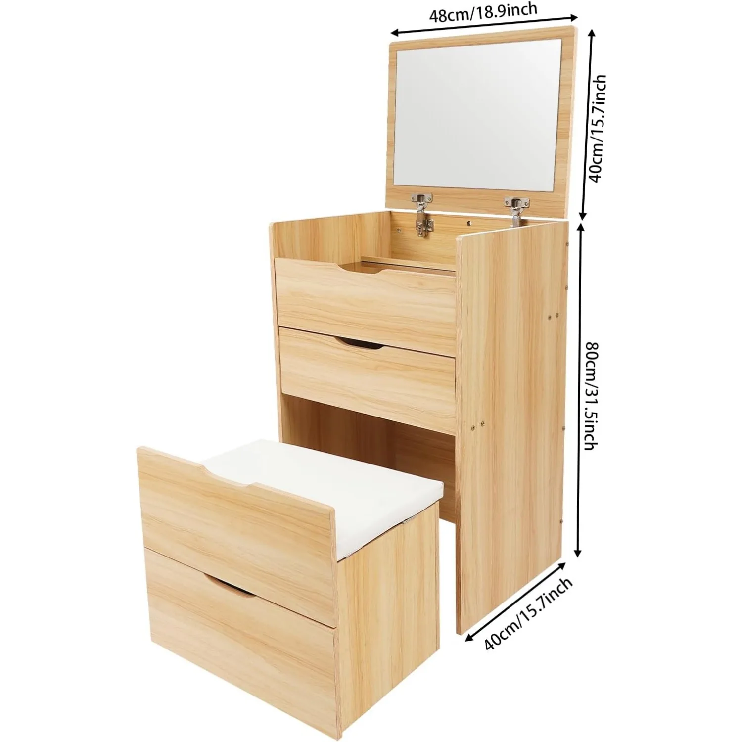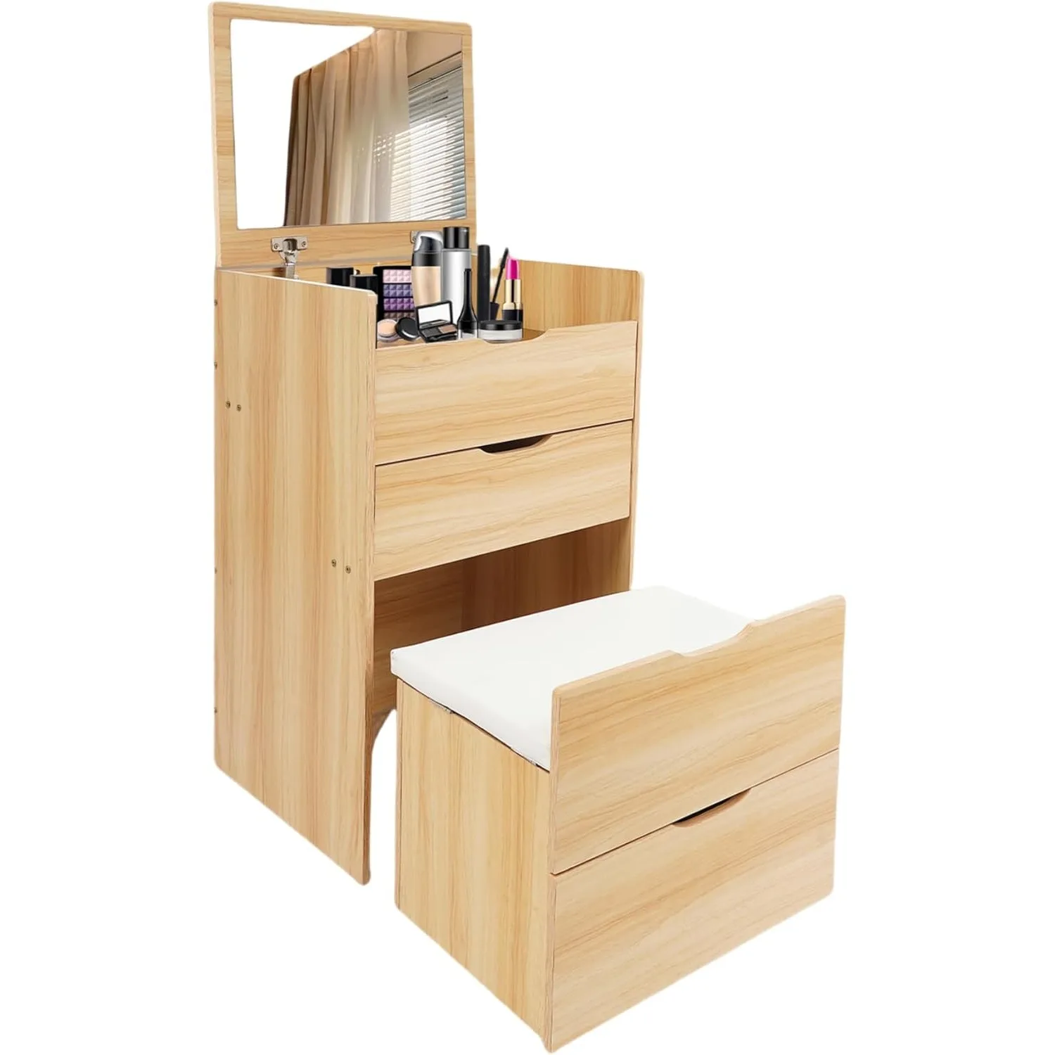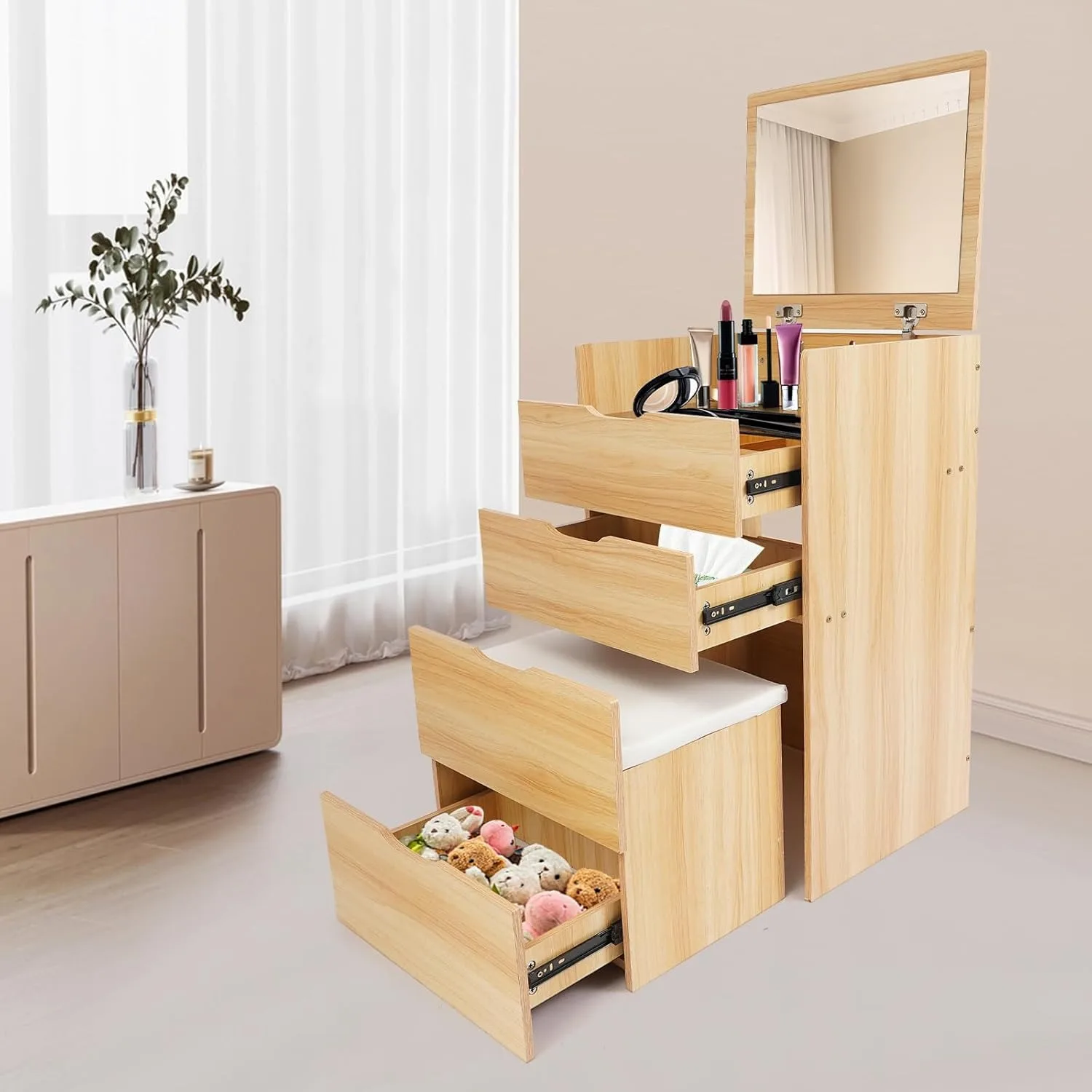 Log Color 3-in-1 Flip Top Makeup Vanity Desk with Mirror, 3 Drawers & Cushioned Stool, Space-Saving Design for Small Rooms