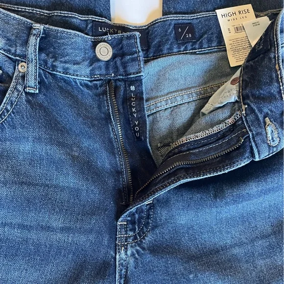 Vintage cool meets a soft spun cotton in the high-rise wide leg jeans from Lucky Brand. Relaxed fitHigh WaistWide leg, slightly taperedZipper and button closure at frontBelt loopsLight faded whiskering detail at frontMild factory fading/distressingFive-pocket styling100%Machine washableImportedApprox. Flat lay measurements:Waist 15”Inseam: 32.5"High rise 11.75" Leg opening11.5” - 9.5”