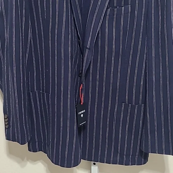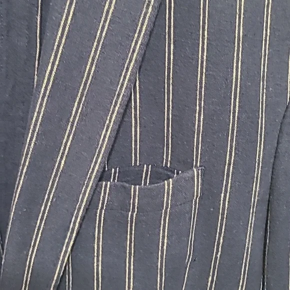 Elevate your style with this sophisticated navy striped blazer. Perfect for formal occasions or adding a touch of elegance to your everyday look.