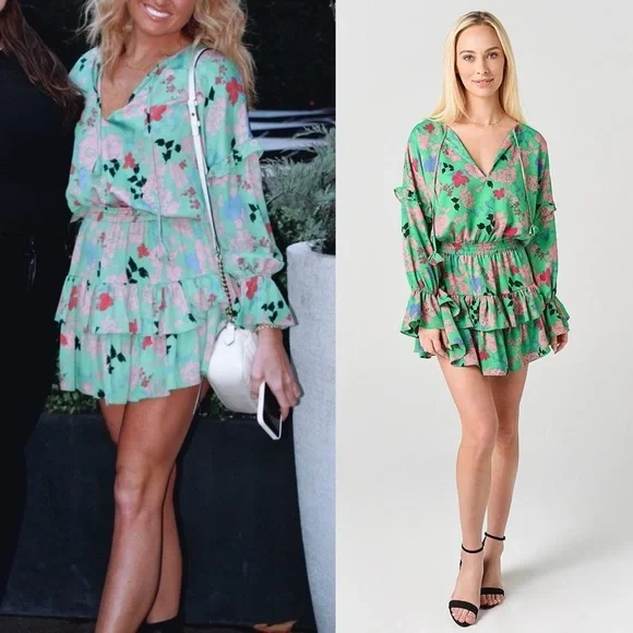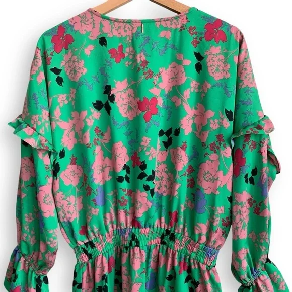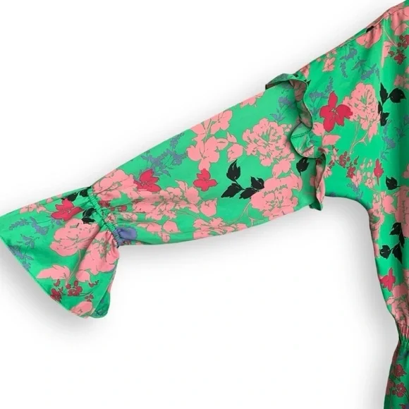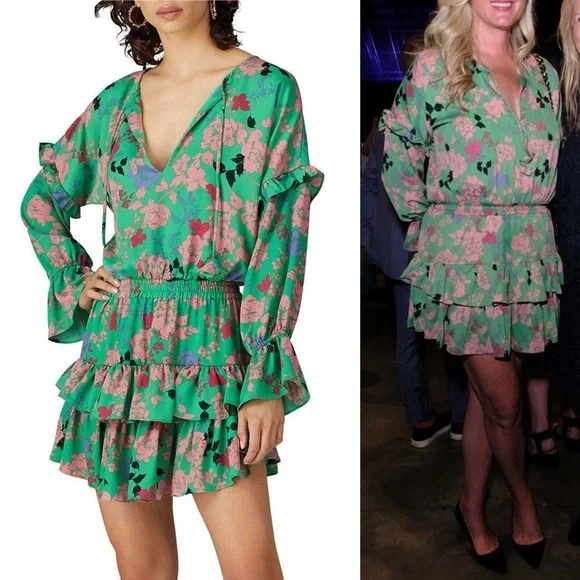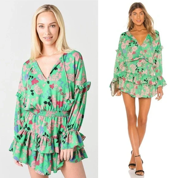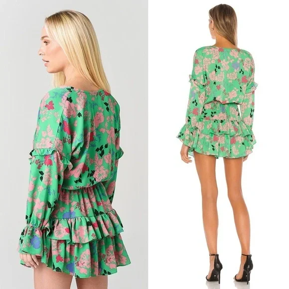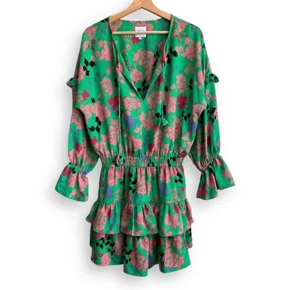 MISA Los Angeles Amalya DressSize: Medium MColor: Peony Multicolor Green, Coral Pink, Bright Pink, Black, Lavender PurpleCondition: very good, no rips, stains, tearsCut from a lightweight crepe satin, this floral dress is defined by feminine ruffle details that decorate the long sleeves and tiered mini skirt. Featuring a split neck opening with petal string ties, Amalya is handcrafted with an elastic waistband for ideal comfort and fit. An eye-catching silhouette that effortlessly transitions from daytime to evening and perfect to pack for your next vacation.Mini dress lengthSplit V neck neckline with tassel detailRuffle details throughoutTiered skirtElastic stretchy waistbandSlip on stylingSmocked waist and cuffsConvertible neckline with tie closure at collarAllover floral peony print patternLong sleevesMade in USArent the runway rtr wedding guest chic formal dress special event occasion boho bohemian coastal indie spring summer fall day dress sundress graduation dress cocktail dress homecoming birthday dress hoco tropical travel vacation resort resortwear western cruise flowy bridal shower baby shower beachy feminine bold vibrant colorful y2kFabric content:100% PolyesterMeasurements (flat, approx, inches):Armpit to armpit - 22Waist - 13.5 (stretchy)Length (front shoulder to hem) - 36Offers welcomed