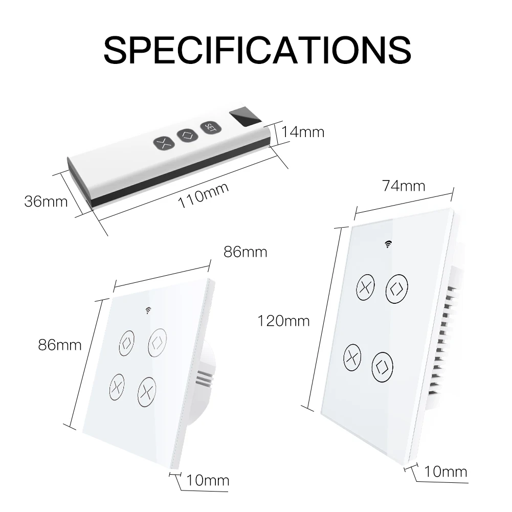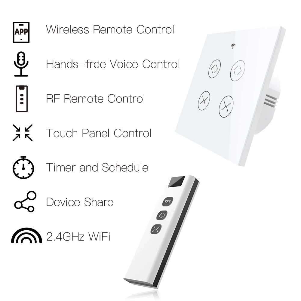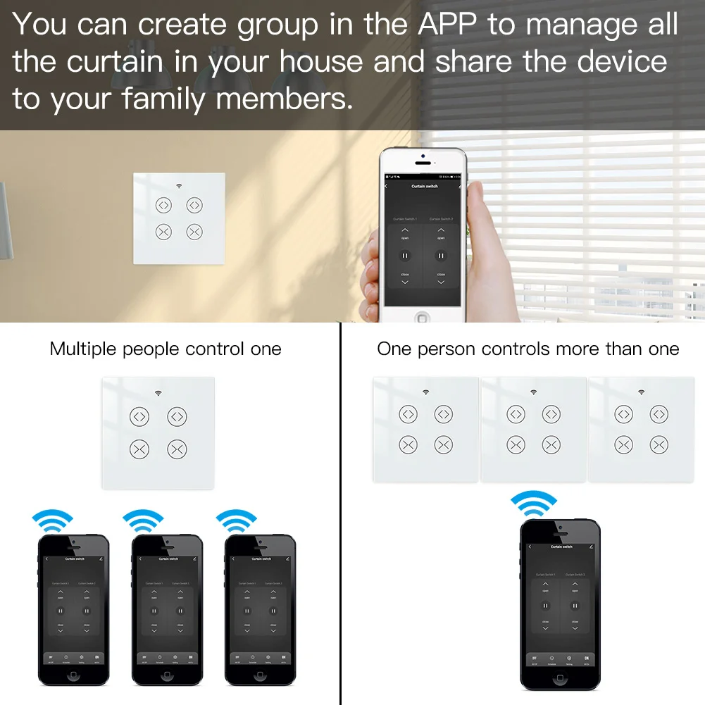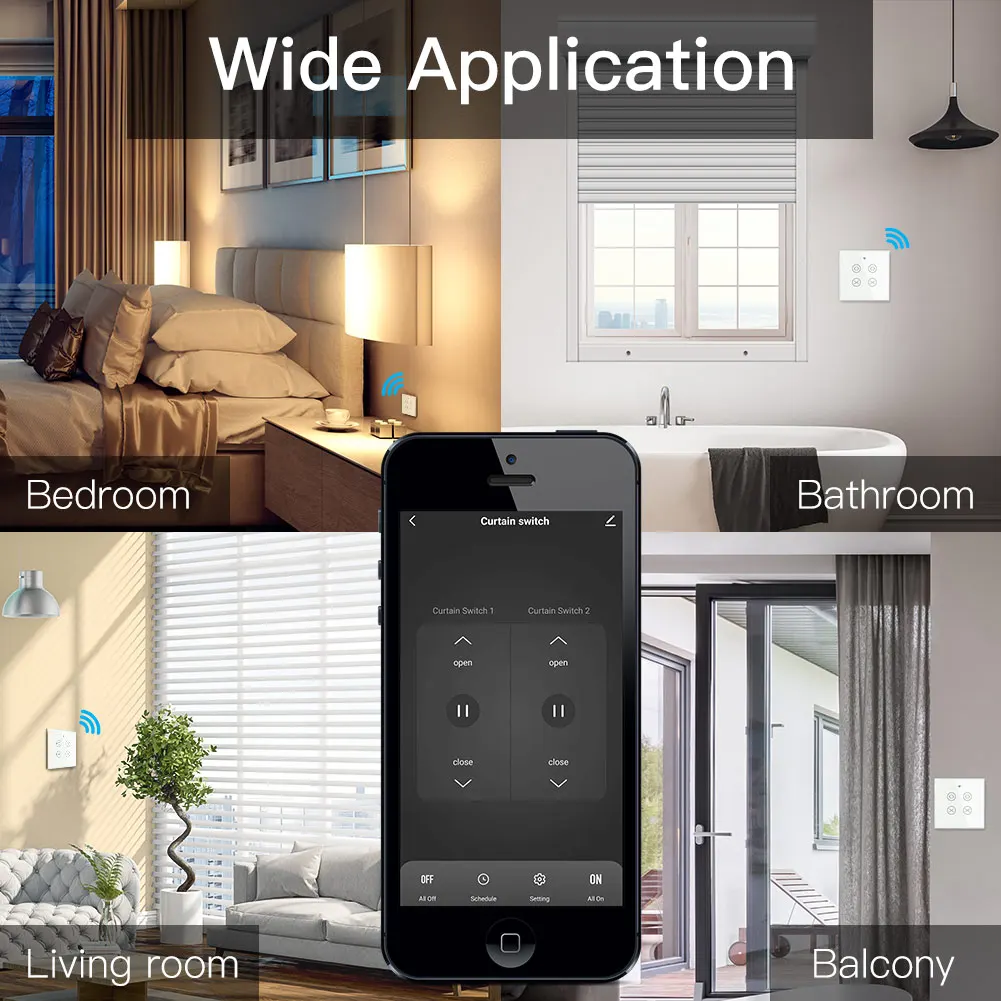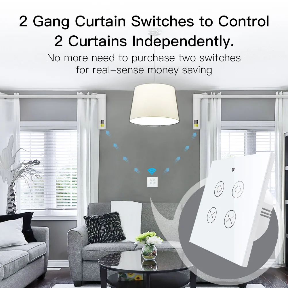 1.Easily transform your house into a smart one with the new powerful functional smart curtain switch;Intelligently control your two roller blinds or shutter curtains in a much easier way with independent controlling modes;or simply press all on/all off button in app for controlling together;RF remote and manual control your curtains optional and available meanwhile with RF frequency built in,so as group control multiple switches with one Remote switch;can work with smart curtain motor for roller shutter/blinds to realize automation for all curtains at home;add motorized shades or other similar devices to your smart home with Smart Curtain Motor!(Note:the curtain motor is not included in the package,you need a self-purchase of it with 4 wires;RF remote control switch is not included in the package.)
