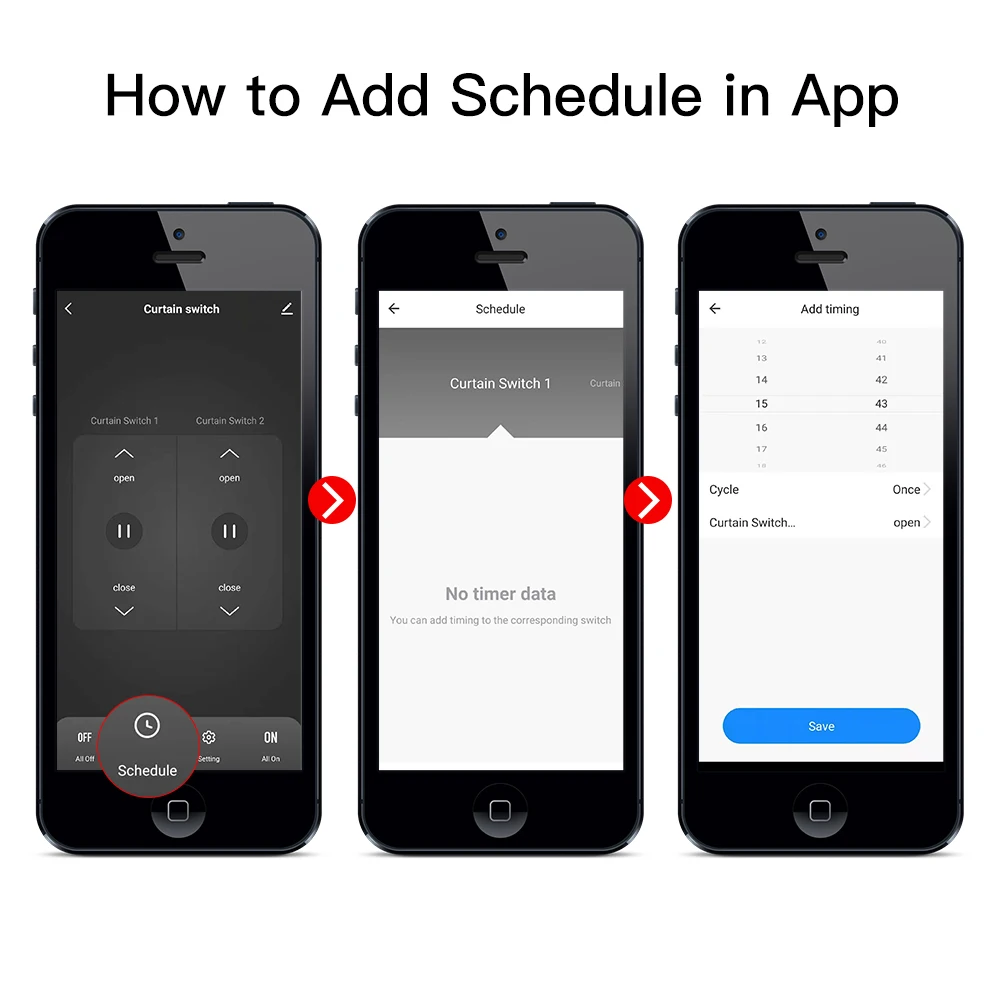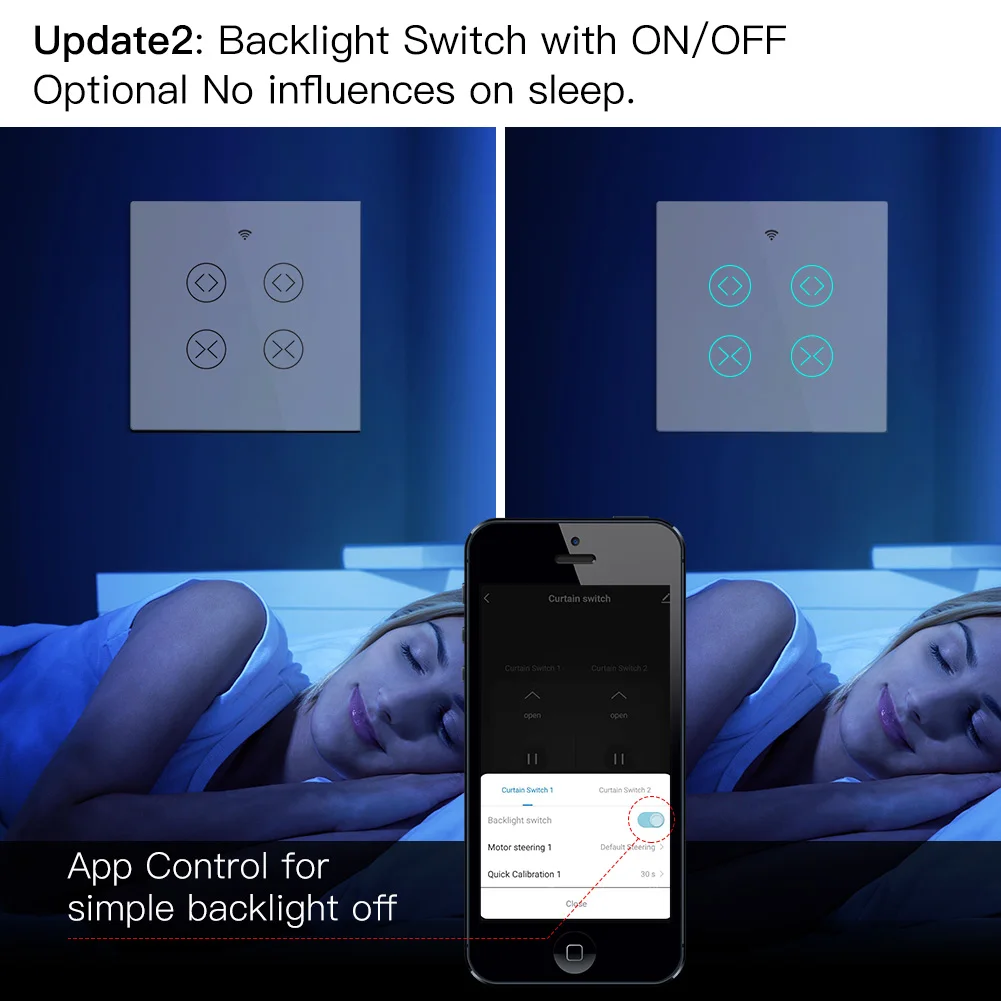 3.Extremely simple design with four buttons only on the switch panel and no complex operations.Press any close/open button for one curtain twice to stop it immediately;Reinsert new features into upgraded Smart Life Tuya App backlight switch setting also,providing much more humanized intelligent operation design for your smart lifestyle with no disturb of the backlight when sleeping;share control with family and friends for added convenience.