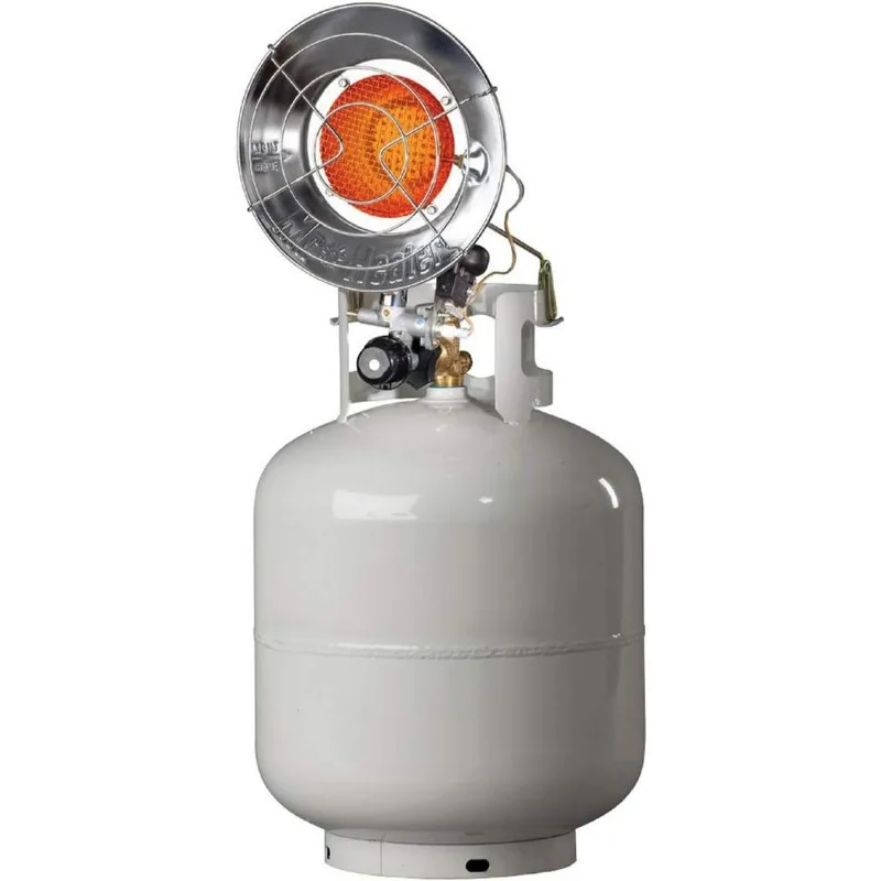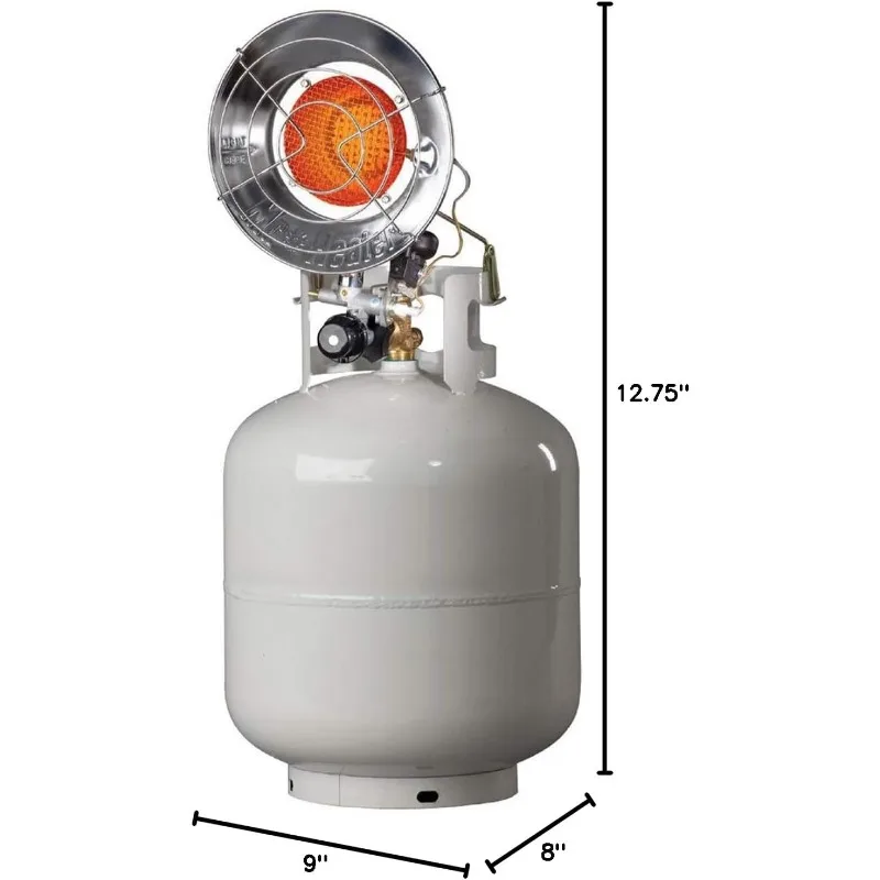 Mr. Heater Original Tank Top heaters are the ideal portable heater for your propane gas tank. A great source for economical heat from sporting events to ice fishing. This portable tank top heater is radiant at 10,000 - 15,000 BTU per hour, the perfect solution for a variety of outdoor heating applications. You will be able to use it straight out of the box, with its adjustable high-medium-low regulator and soft nose P.O.L., the tank top heater is easy to use and quick to set up. The addition of an Electronic Spark Ignition gives this heater a convenient match-free starting advantage, which is perfect for use on cold days when gloves are worn with its solid stainless steel and high-quality chrome construction this heater will bring you reliable heat on the go. Its higher grade mesh brings you longer lasting durability while its standard safety shut-off switch brings you peace of mind. Stay warm and cozy wherever you go with the Single tank top heater by Mr. Heater.