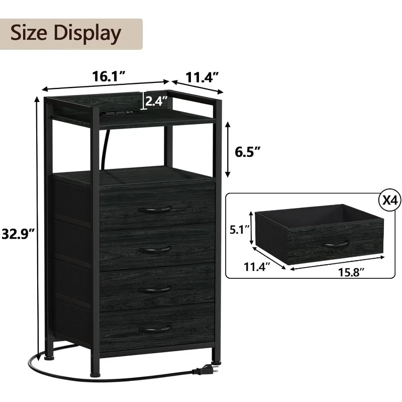 Sturdy Structure: Constructed from high-quality materials, this nightstand with charging is durable and long-lasting. The overall frame is made from metal and the shelf is wooden. And the anti-toppling device is provided to help to reduce the risk of injuries, especially important in households with children or pets.