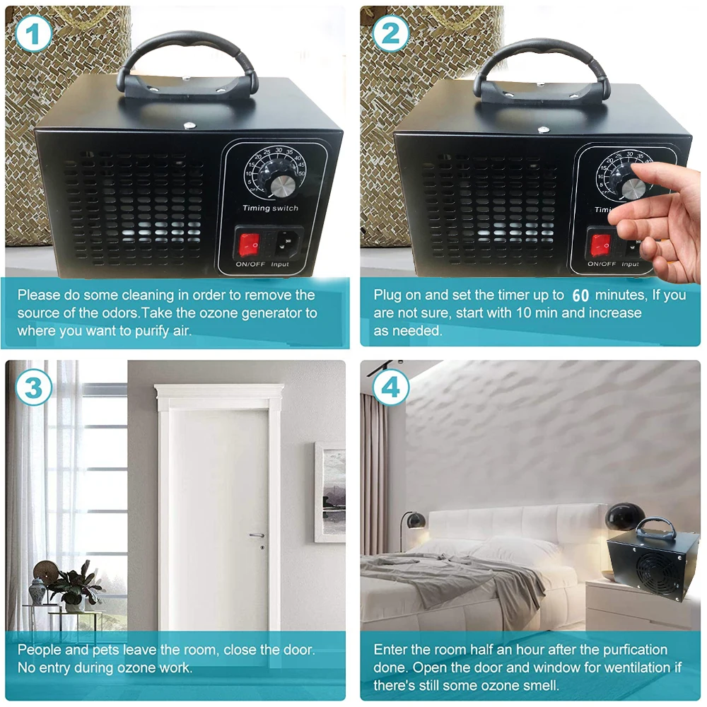 EASY OPERATION: Turn the timer knob. Leave the space. When ozone generation is finished, allow an additional 30 minutes for any residual ozone to revert back to breathable air.