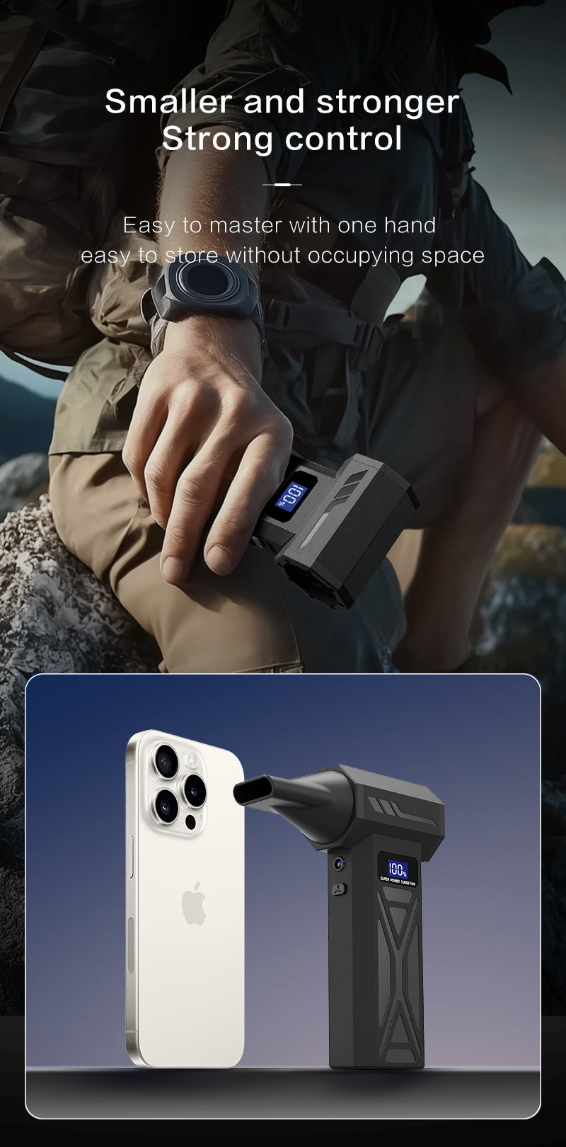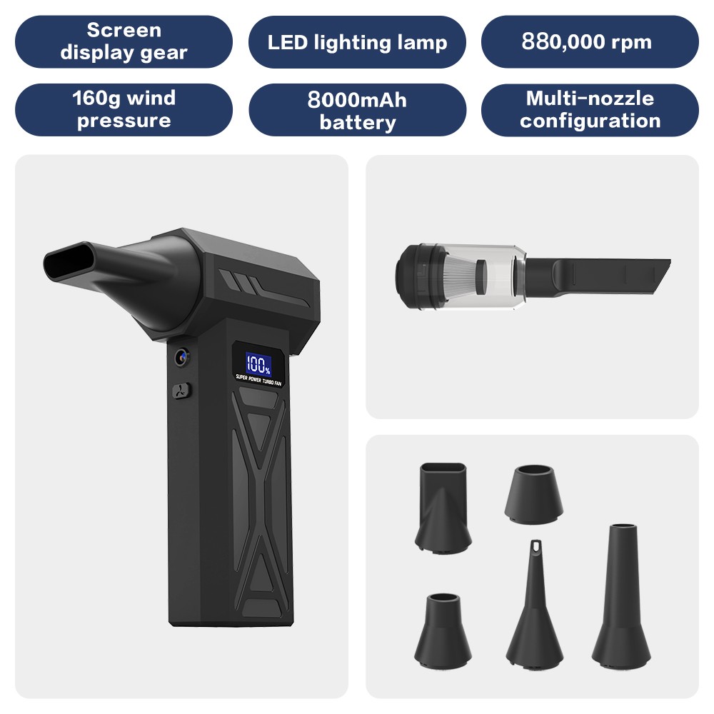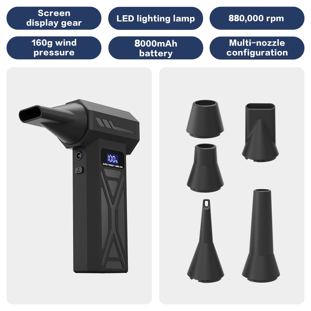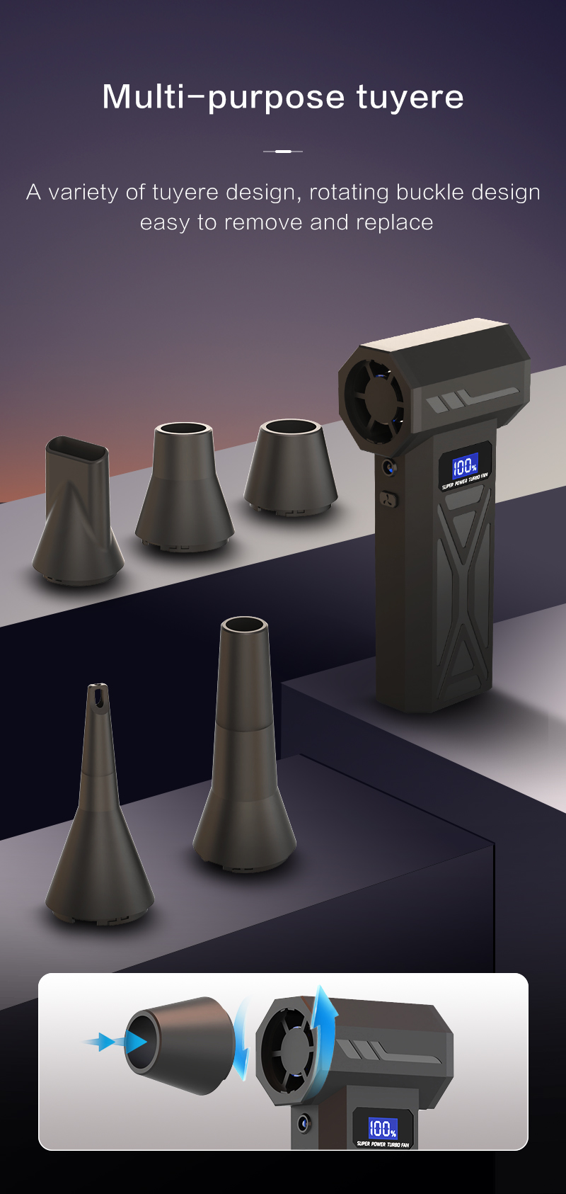 Easy to use operation:Knob stepless speed regulationThe user-friendly design of portable turbo fans ensures easy functionality. In addition, the charging board also has safe and reliable charging protection and overheating protection functions. The internal brushless motor can achieve high speeds of up to 880000RPM (revolutions per minute).