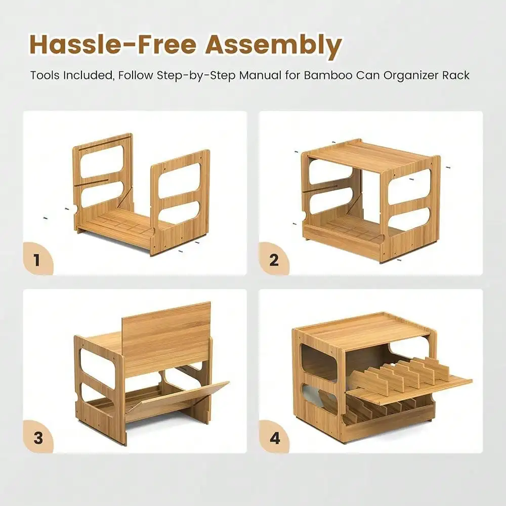 Easy Assembly and Quick Setup: We understand the importance of convenience, which is why our can organizer is designed for easy assembly and quick setup. No complicated instructions or tools required. Simply follow the intuitive assembly process and you'll have your can organizer ready to use in no time.