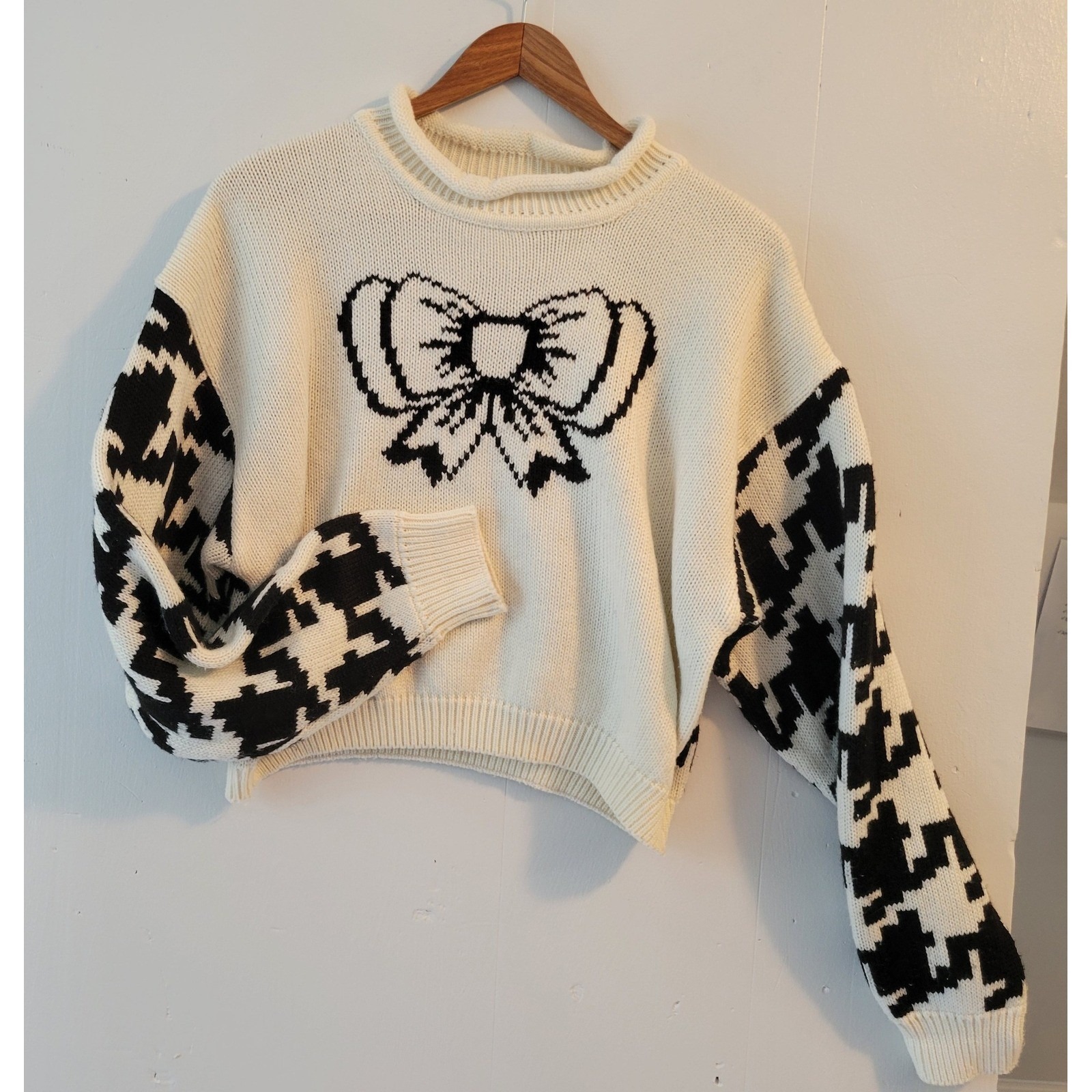 Vintage charm unfolds in this statement sweater. Imagine slipping into its soft embrace, the playful bow detail adding a touch of whimsy to your ensemble. The contrasting houndstooth sleeves create a bold, eye-catching element, while the cropped length offers a contemporary twist on a classic knit. Perfect for a cozy brunch date, a stroll through the park, or adding a touch of retro flair to your everyday style.