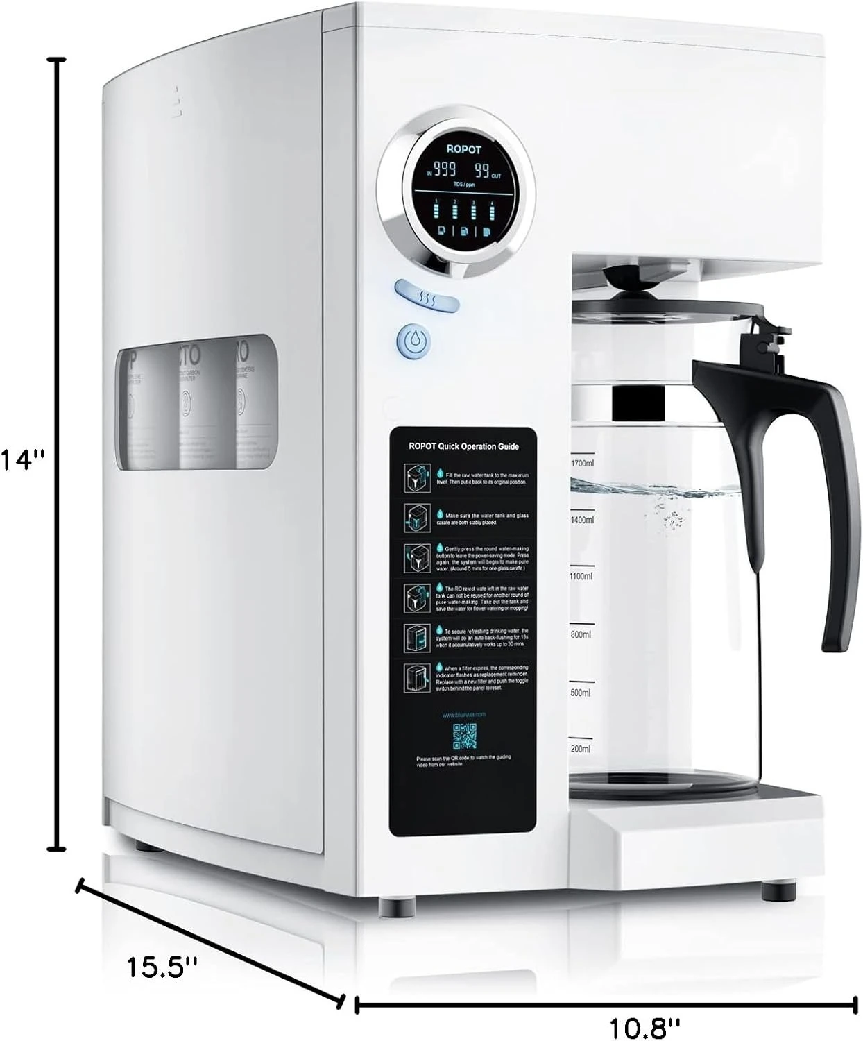 COUNTERTOP FILTRATION + PREMIUM-QUALITY CARAFE: No plumbing or installation is required for this RO system. Simply plug this portable piece of tech into any power source and you're ready to fill it up and go! Better yet, the water container is constructed of a high borosilicate glass carafe instead of the traditional plastic, reducing the risk of secondary pollution and making this one of the best countertop water filter systems.