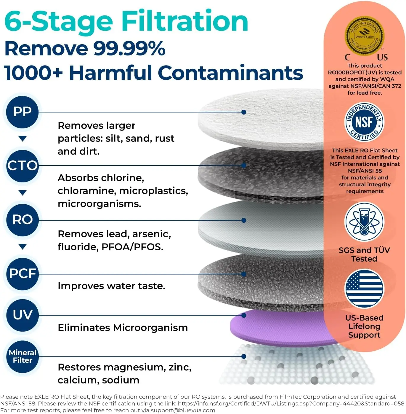 6-STAGE ADVANCED FILTRATION WITH UV LIGHT: The RO100ROPOT-UV boasts a superior 6-stage filtration system, featuring a 0.0001μm RO membrane, including UV light and an added remineralization filter. Certified by WQA against NSF/ANSI/CAN 372 for lead-free and tested by SGS, this combination effectively reduces TDS, PFOA, PFOS, Chlorine, Fluoride, Arsenic, Lead, and more, while also enriching water with essential minerals, balancing taste and health benefits.