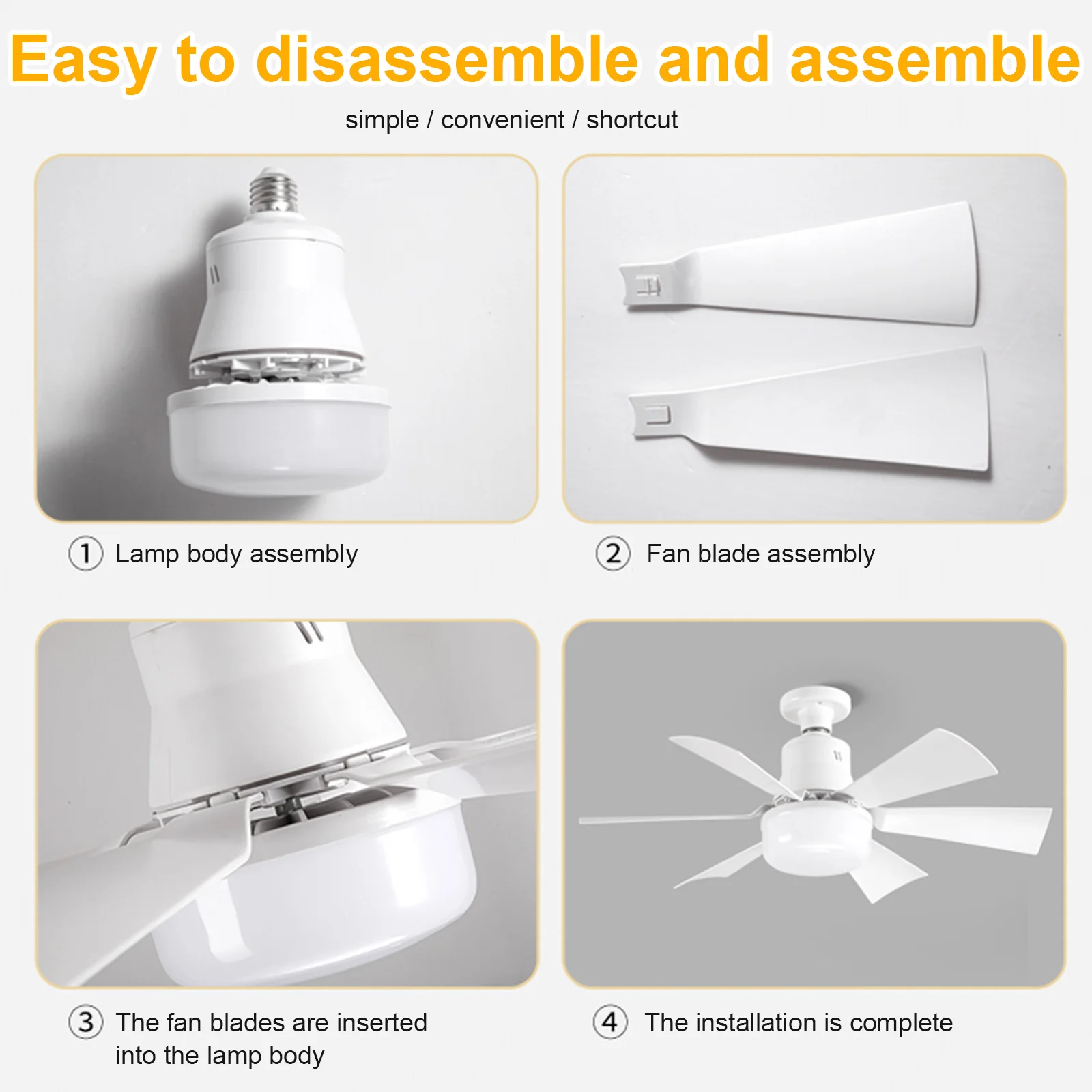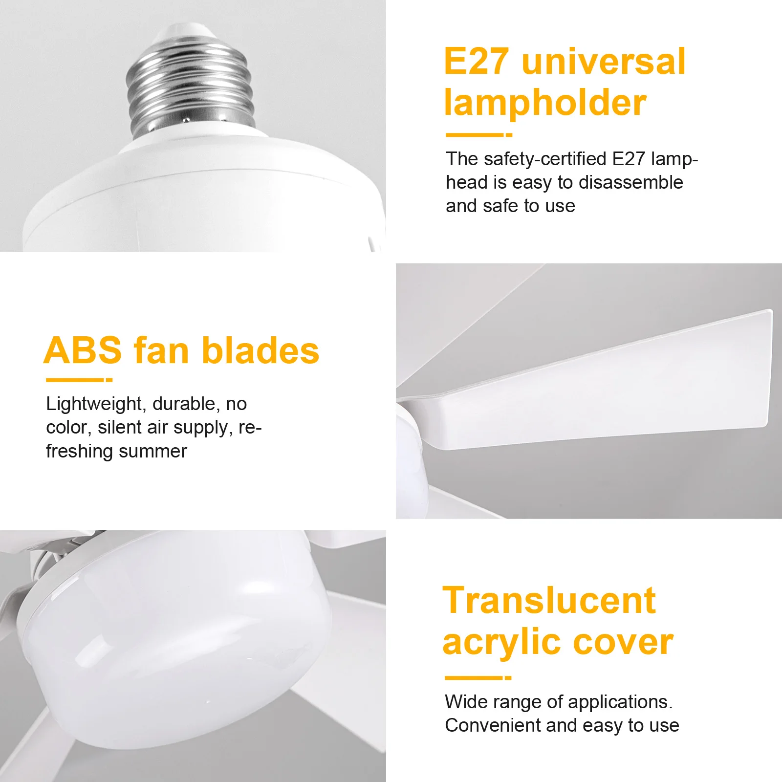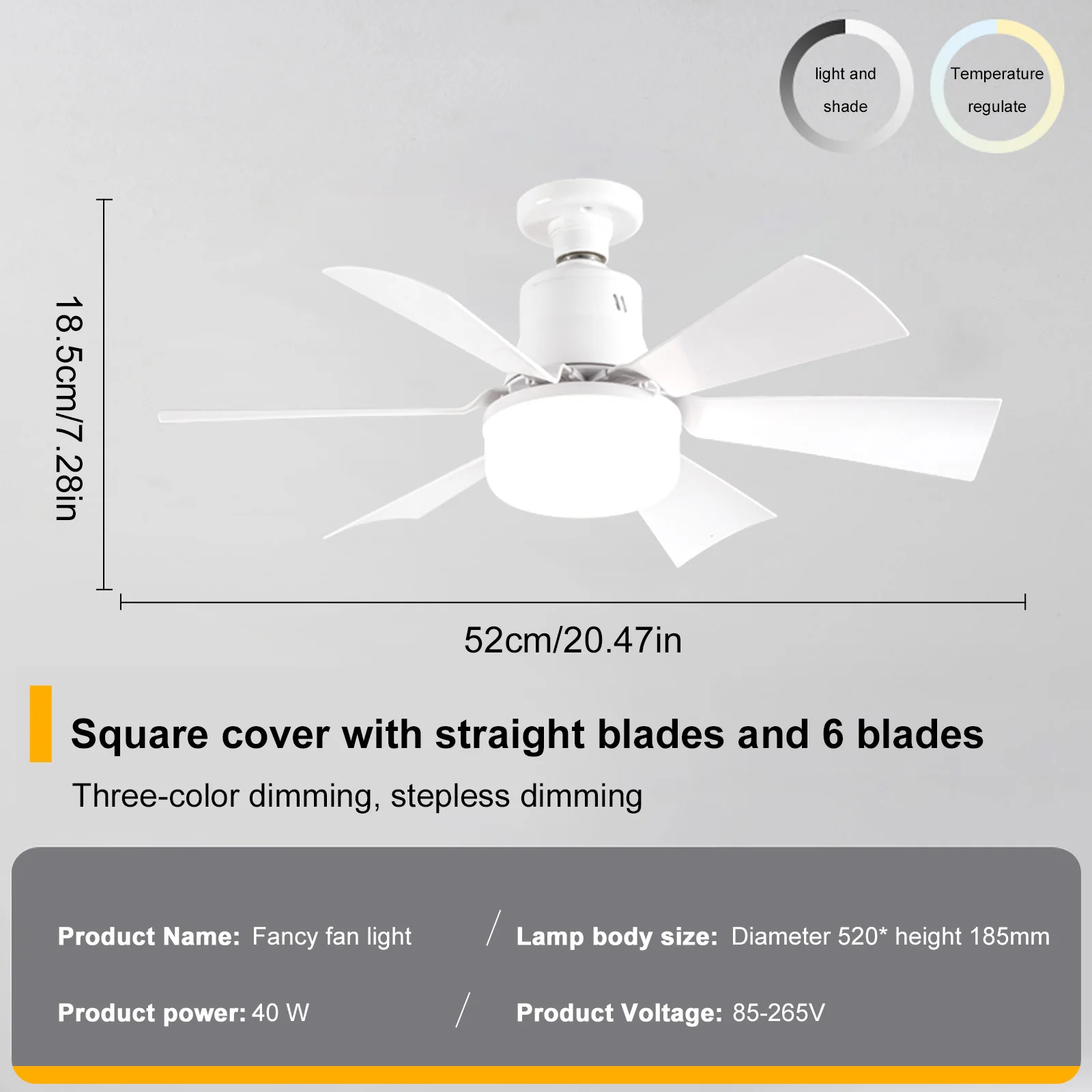 1. Stylish Versatility: The socket fan light features a sleek white design that seamlessly integrates with diverse home decor styles, making it easy to find the perfect match for your interior aesthetic and enhance your living space. Specification: Origin: Mainland China 6-leaf square 30W diameter 40cm 6-leaf round 30W diameter 40cm 6-leaf square 40W diameter 52cm 6-leaf round 40W diameter 52cm Material: Plastic Function: three-color light, color temperature adjustment, brightness adjustment, three-speed speed adjustment Voltage: 100-240V 50-60Hz Lamp head model: E27/E26 common