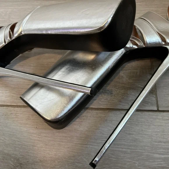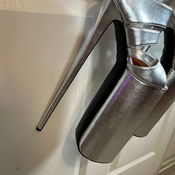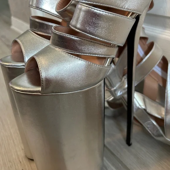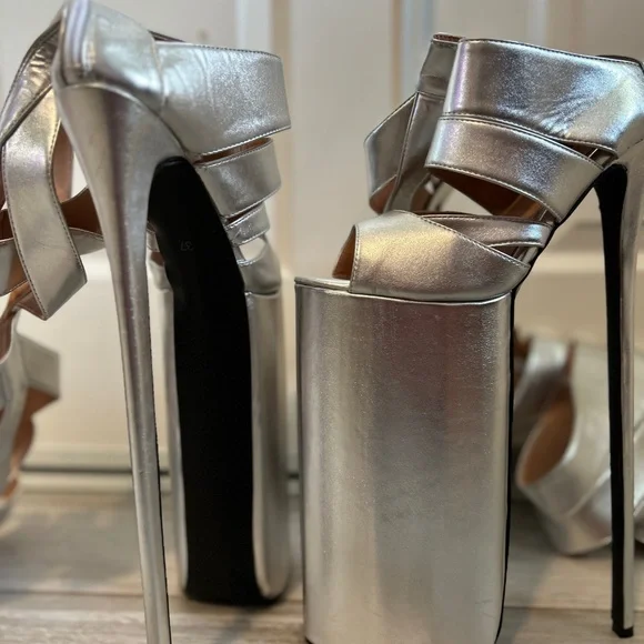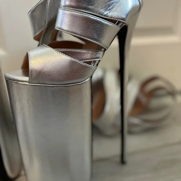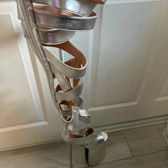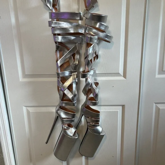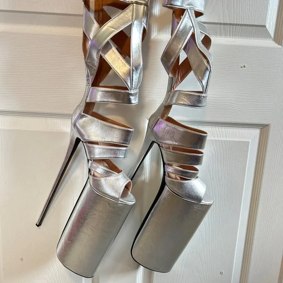 Call all Lady Gaga shoe fans.Exclusive thigh high stilettos are here to elevate your style.Size 37Specifications:Material: Patent LeatherColor: SilverHeel Type: Thin High HeelsDesign: Hollow Out, Open ToeOccasion: Dress, Party, RunwaySize Range: Refer to Size ChartHeel Height: HighFeatures:Thin High Heels Sexy Lady Shoes**Elegant Design and Comfort**Step into the spotlight with the Blue Hollow Out Platform Boots, a testament to contemporary fashion and comfort. These stylish shoes are crafted from premium patent leather, offering a sleek and sophisticated look that's perfect for any dress, party, or runway event. The hollow out design provides a tantalizing glimpse of your feet, while the open toe adds a touch of elegance and sensuality. The thin high heels offer a sexy lift, ensuring you stand out in any crowd.**Versatile and Practical**Designed with versatility in mind, these platform boots are not just a fashion statement but a practical choice for the modern woman. The high heels provide a confident stride, while the platform sole offers additional support and stability. Whether you're attending a high-profile event or simply looking to elevate your everyday style, these shoes are the perfect blend of sophistication and practicality.