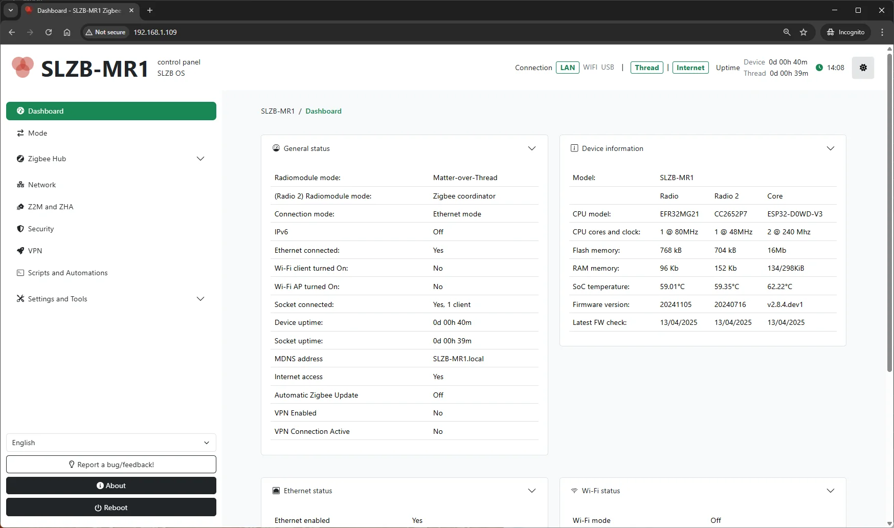 - SLZB-OS supported functionality: VPN, 20+ languages, Scripts support, Network settings, Security, Dashboard, zHub mode, mode switcher, OTA firmware updates etc.