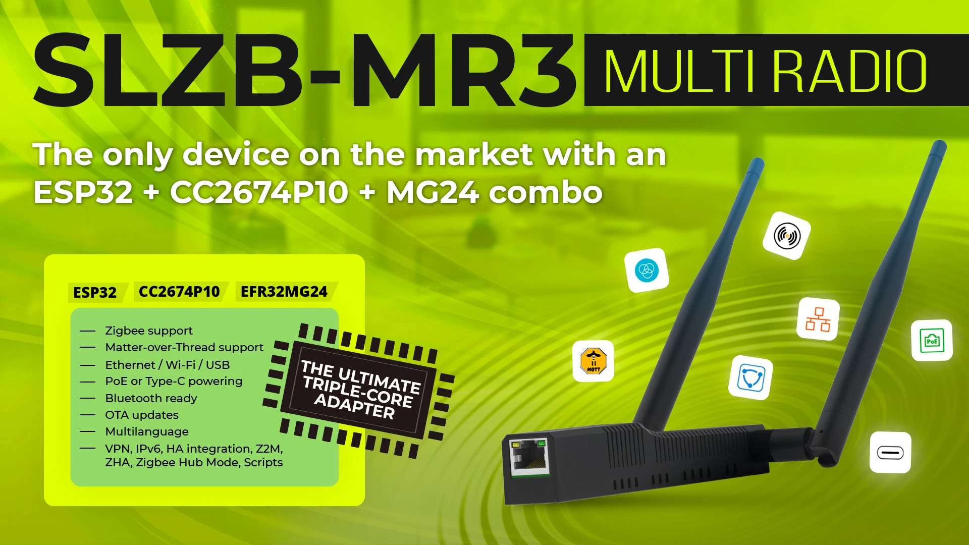 The SLZB-MR1 and MR3 are SMLIGHT’s new coordinators, combining CC2674P10+EFR32MG24 or CC2652P7+EFR32MG21 chips in a single device to deliver full support for both Zigbee and Thread networks. Designed to work seamlessly with Zigbee2MQTT and ZHA, the SLZB-MR1 and MR3 offer unmatched flexibility for your smart home setup. Whether you're building a pure Zigbee network, experimenting with Matter over Thread, or want the freedom to switch between ecosystems, this multiradio coordinator brings it all together - in one powerful solution.