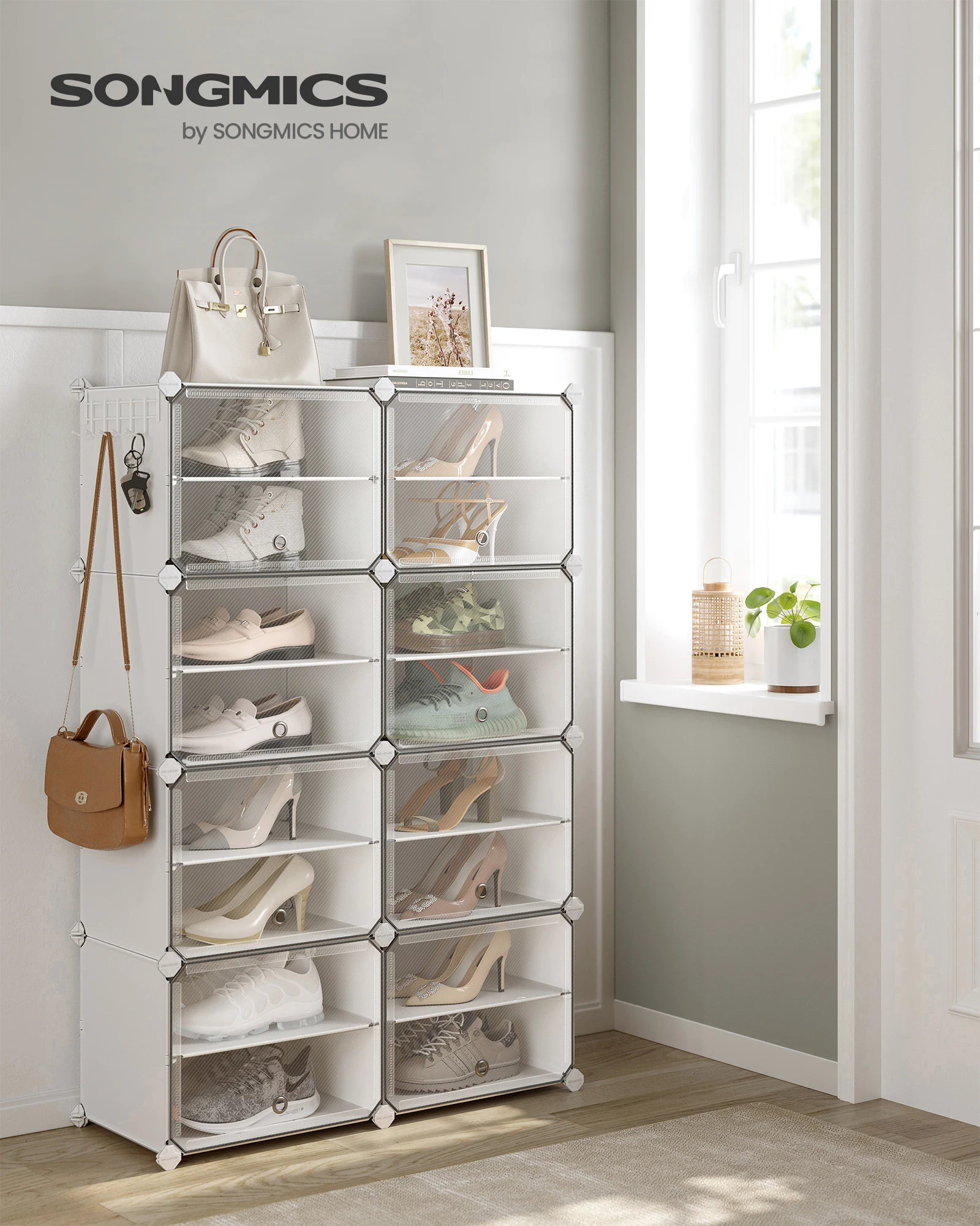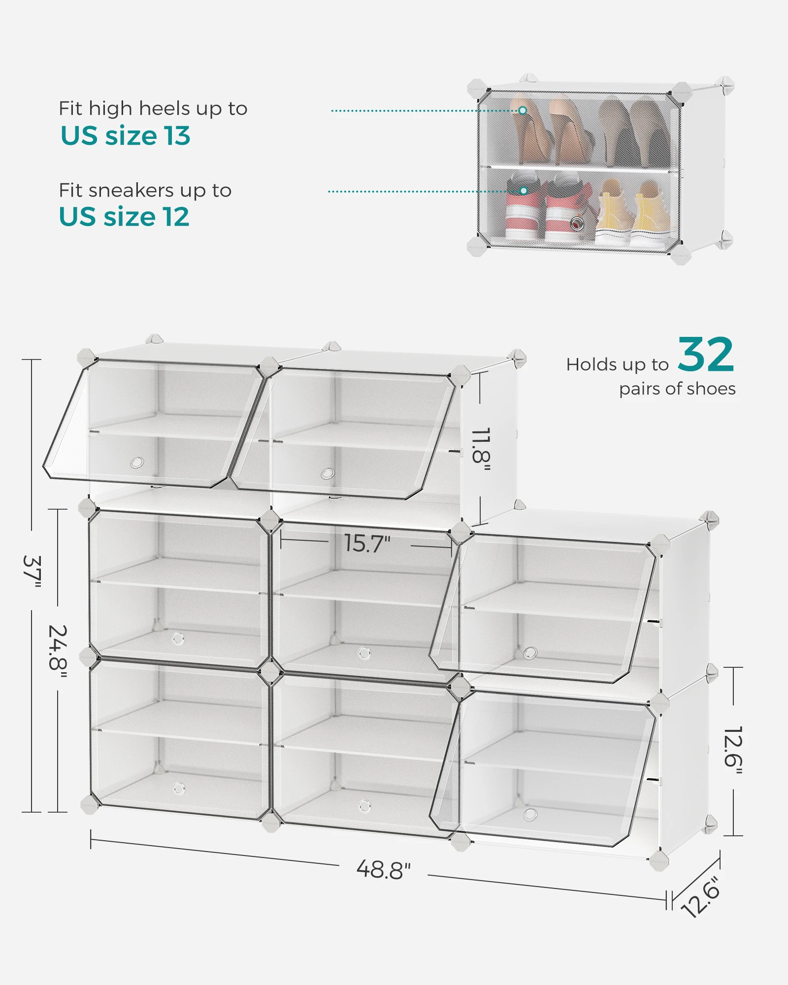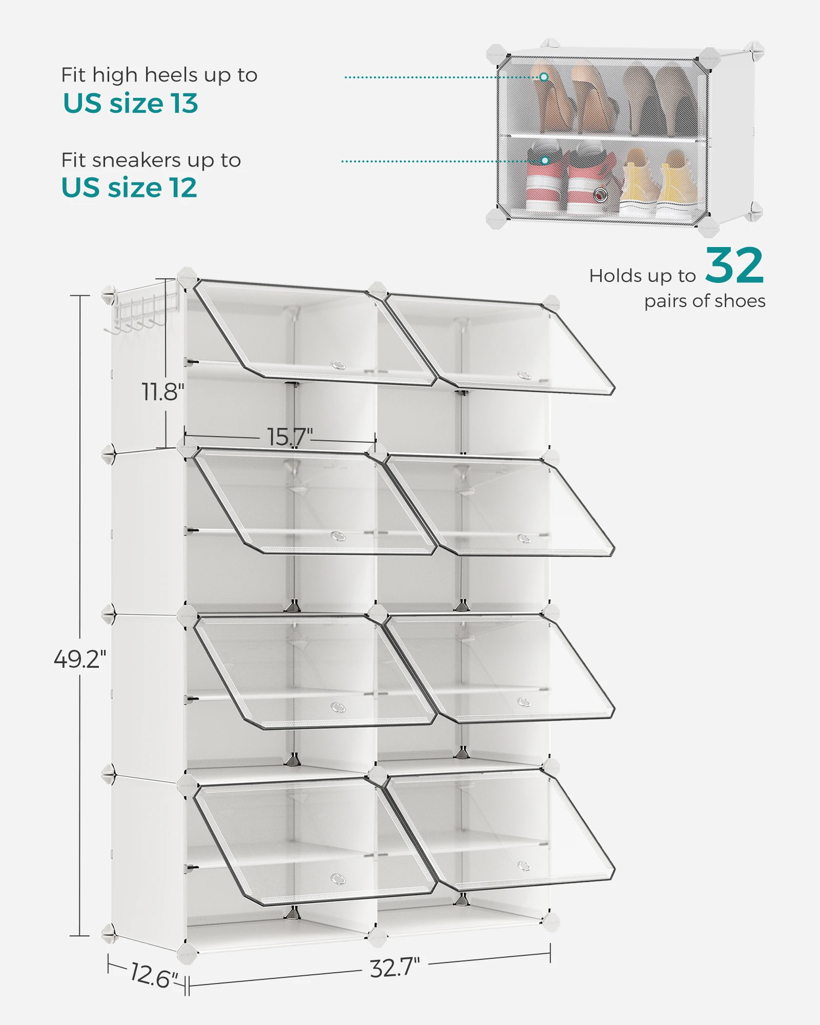 Versatile Storage Solution: This shoe rack offers ample storage for up to 32 pairs of shoes, with adjustable shelves and side hooks for added versatility to accommodate bags, clothing, and accessories.