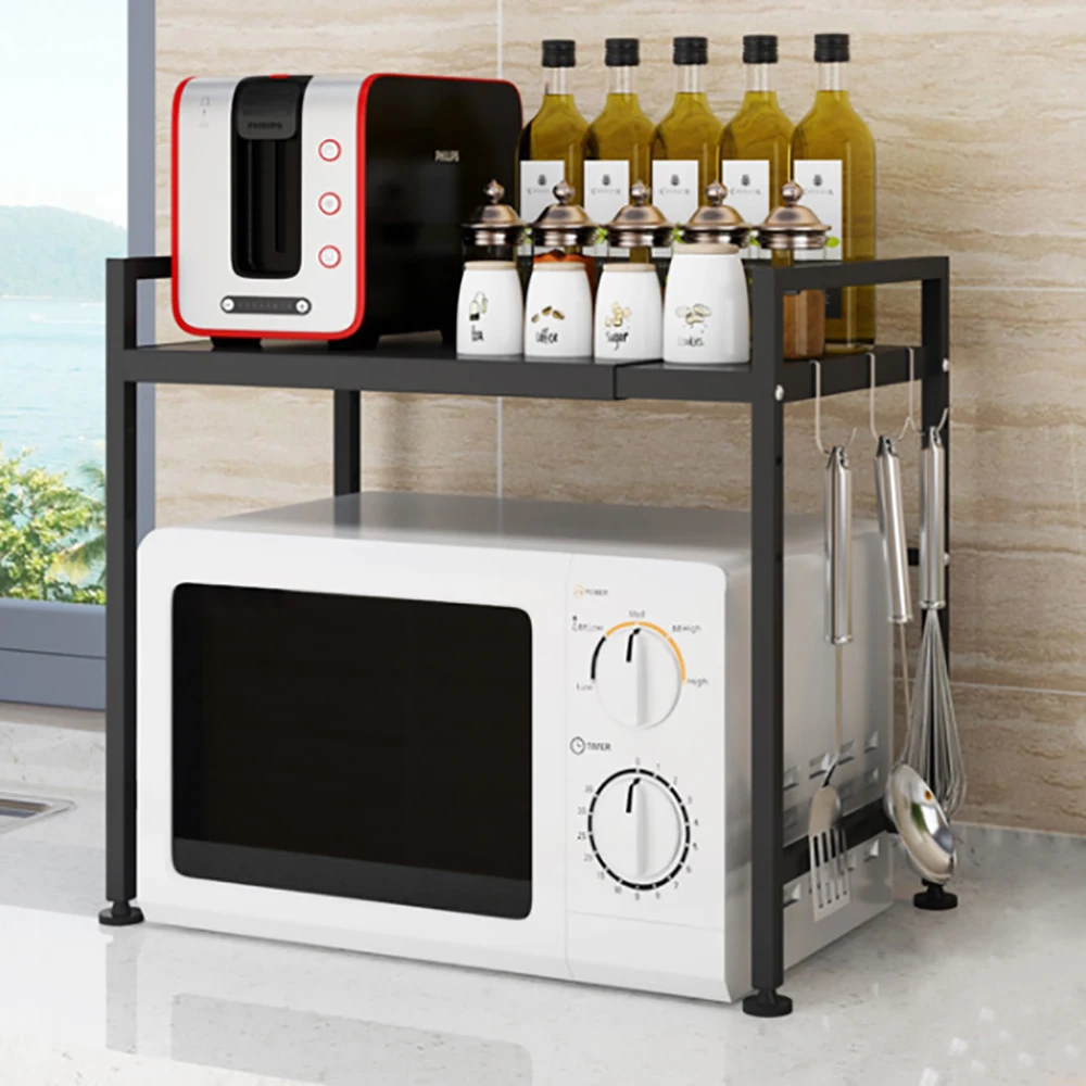 Multifunctional storage rack, not only as microwave shelves, but also as a spice rack. Different types of kitchen supplies can be placed on the top level and hung on the side hooks, and microwaves and ovens can be placed on the bottom level.