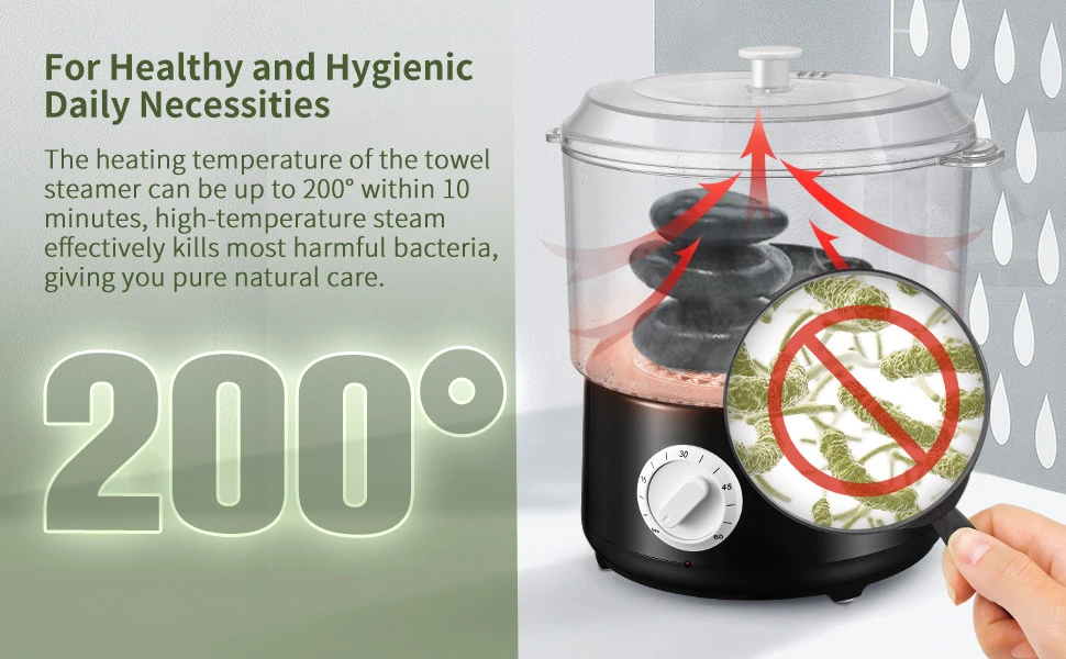3.[Health]: 202 ° F high temperature steam can disinfect towels (no dead corner). Warm towels make it easier for us to clean our skin, and clean hot towels make us healthier.