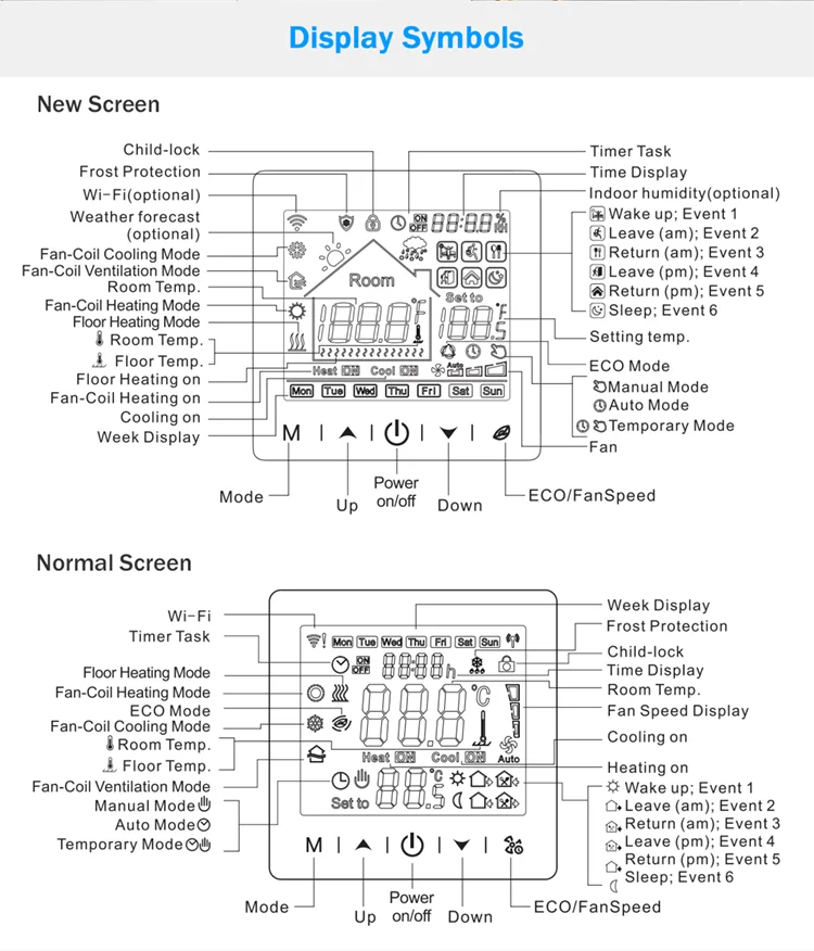 The thermostat supports different temperature setting accordingly with 6 time-modes daily.7 Days programmable