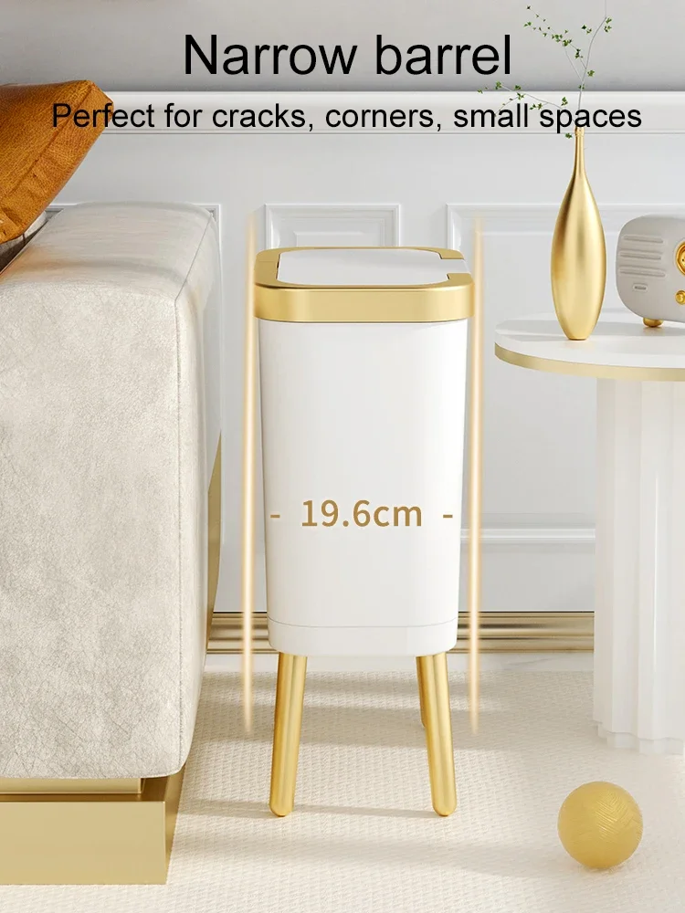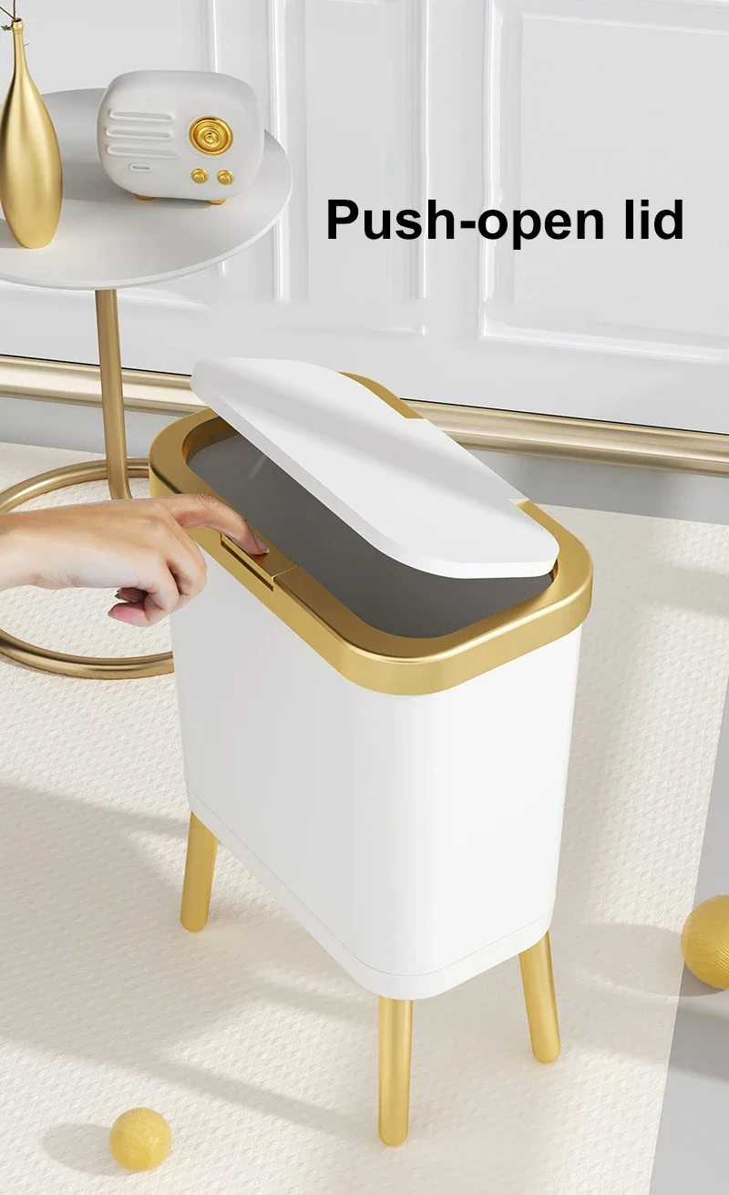 【Unique Design】 This high-legged bathroom trash can features a narrow design that is perfect for small kitchens or bathrooms. Its unique appearance makes this covered black trash can with gold edge more attractive than ordinary ones. The stylish and minimalist design of this plastic trash can with lid easily complements any modern decorative style. You can confidently place this covered office trash can wherever you decide.