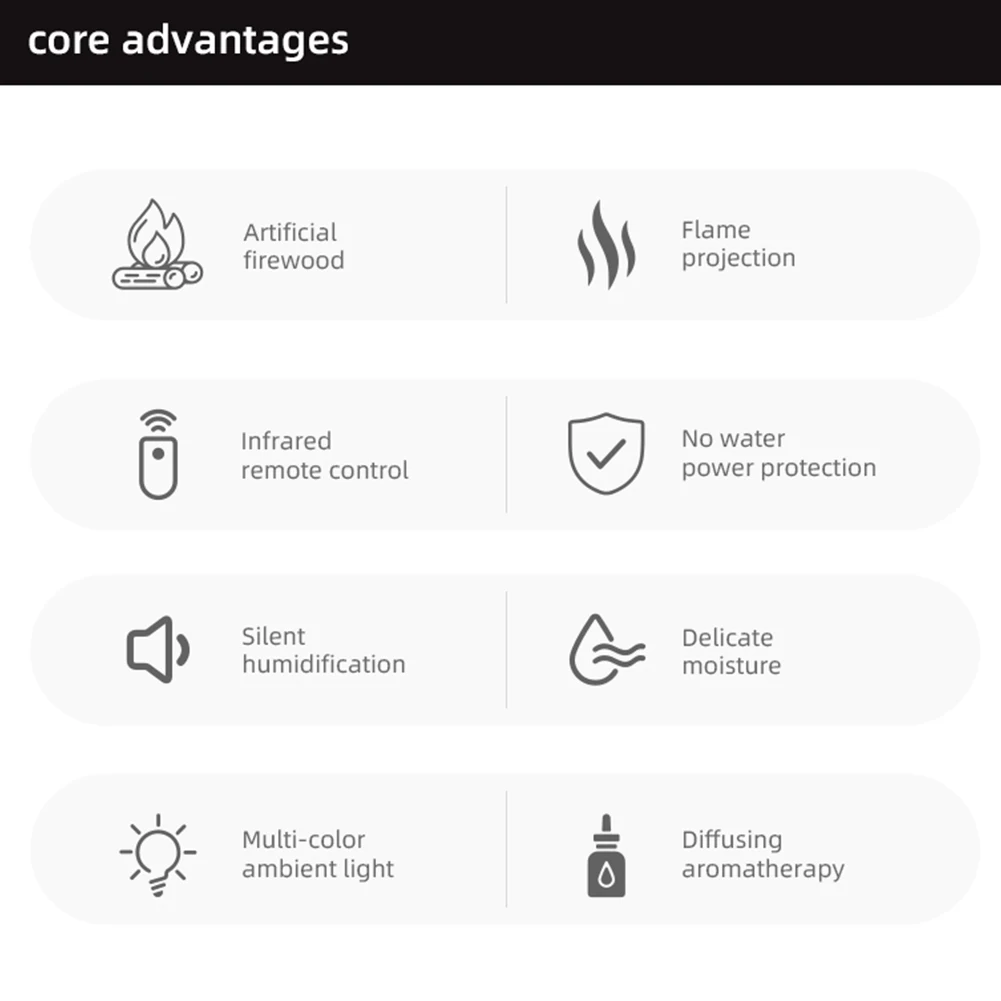 1. Multi-Functional 4-in-1 Device: The fireplace flame humidifier combines humidification, fragrance diffusion, night light, and ambient lighting in one. With a 150ml capacity, simply add 3-5 drops of essential oil to fill your room with a pleasant scent, increase air humidity, and provide a warm, comforting light to accompany your sleep.
