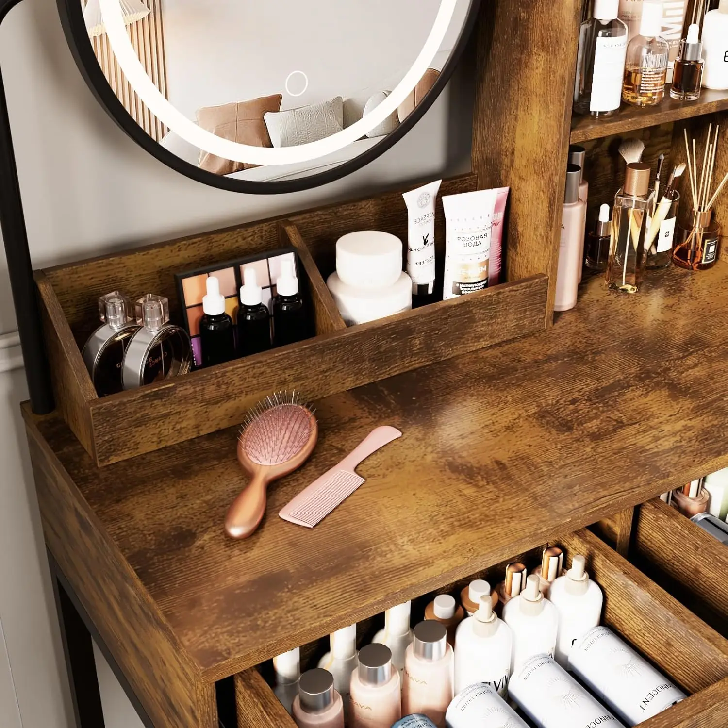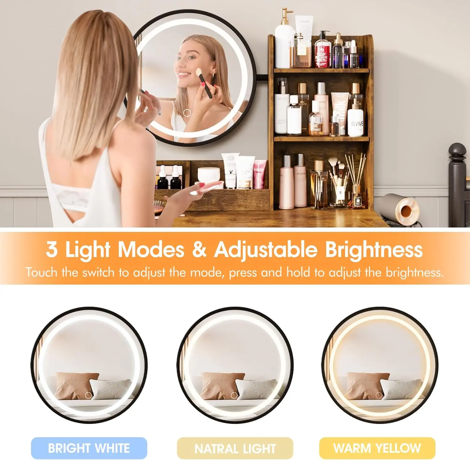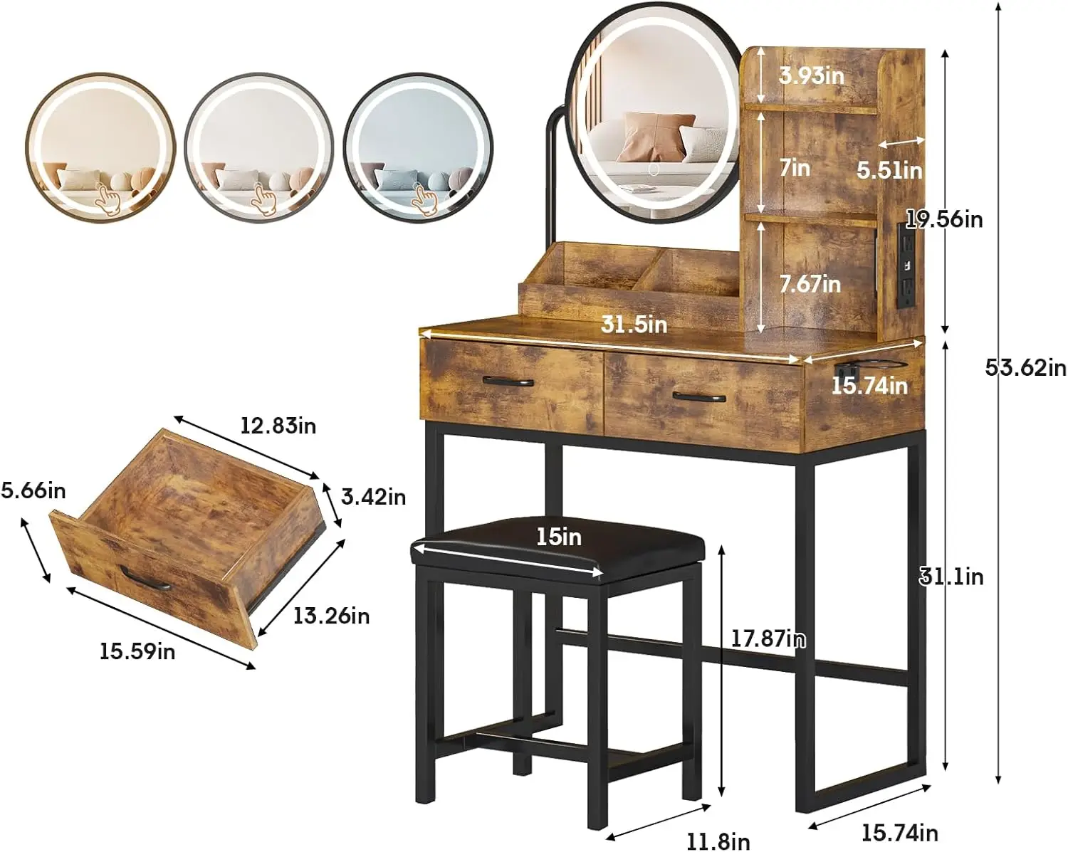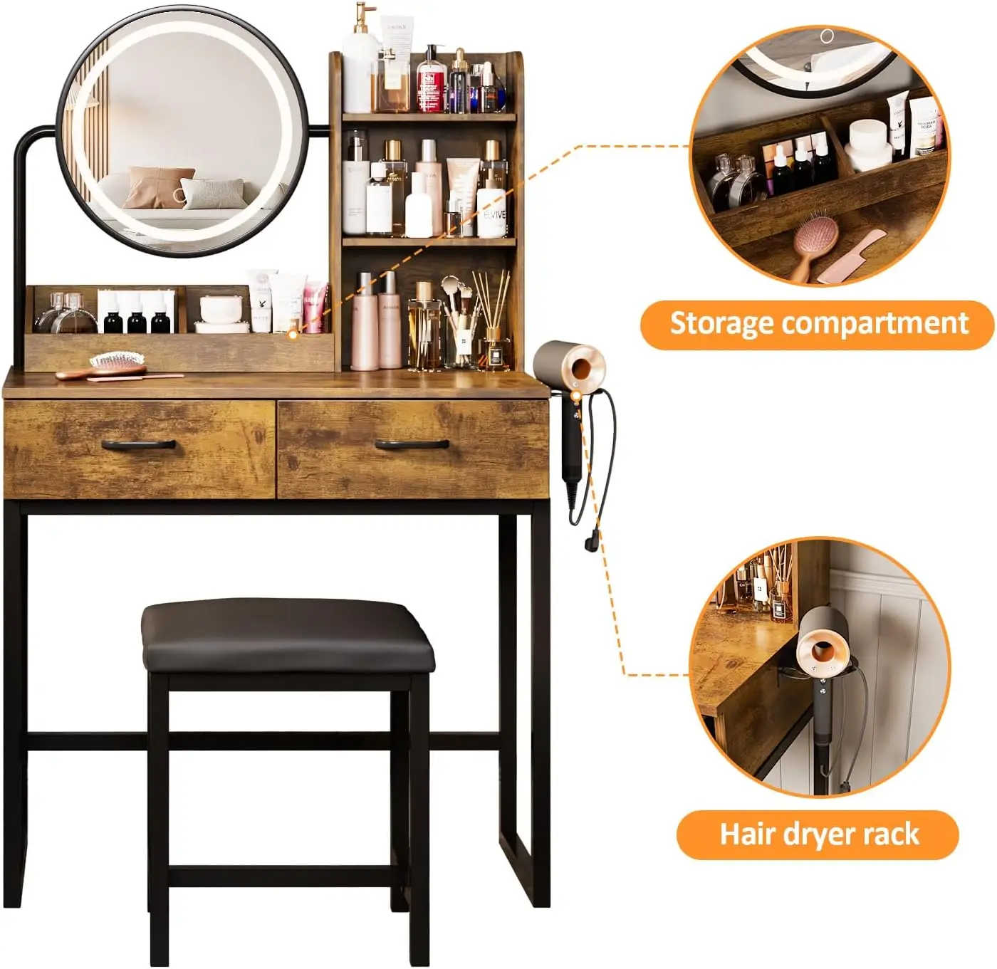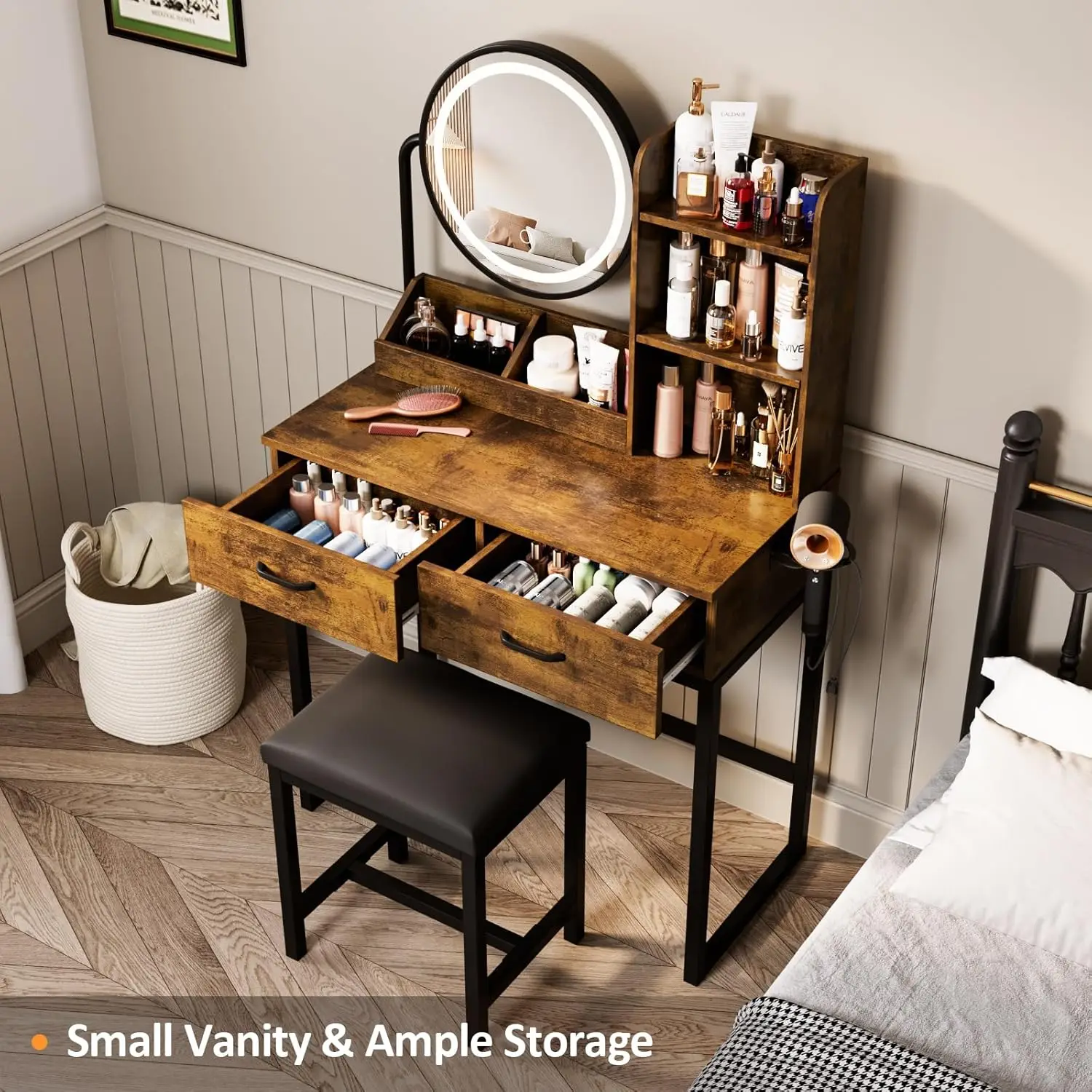 Vabches Vanity Desk with Round Mirror Lights Vanity Table with 2 Storage Drawer&Metal Legs Small Makeup Table with Stool Bedroom