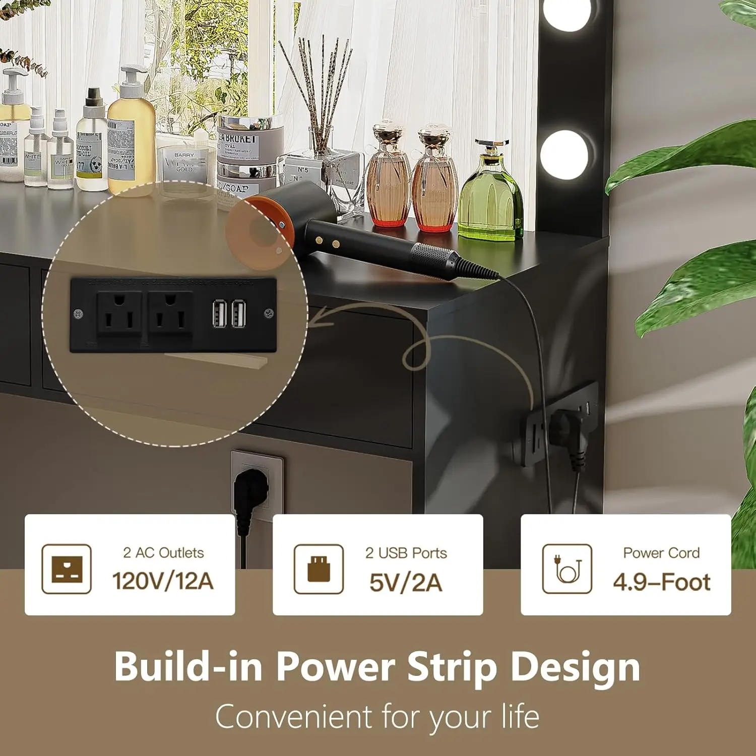 • Vanity Set with Charging Station: Upgrade design! USIKEY makeup vanity set added 2 standard plug sockets & 2 USB ports, more convenient for connecting curling iron, beauty device, hair dryer and phone charging, instantly completes a perfect hairstyle in front of this vanity(The charging center is specially designed setting on side of the vanity to reduce desktop clutter)